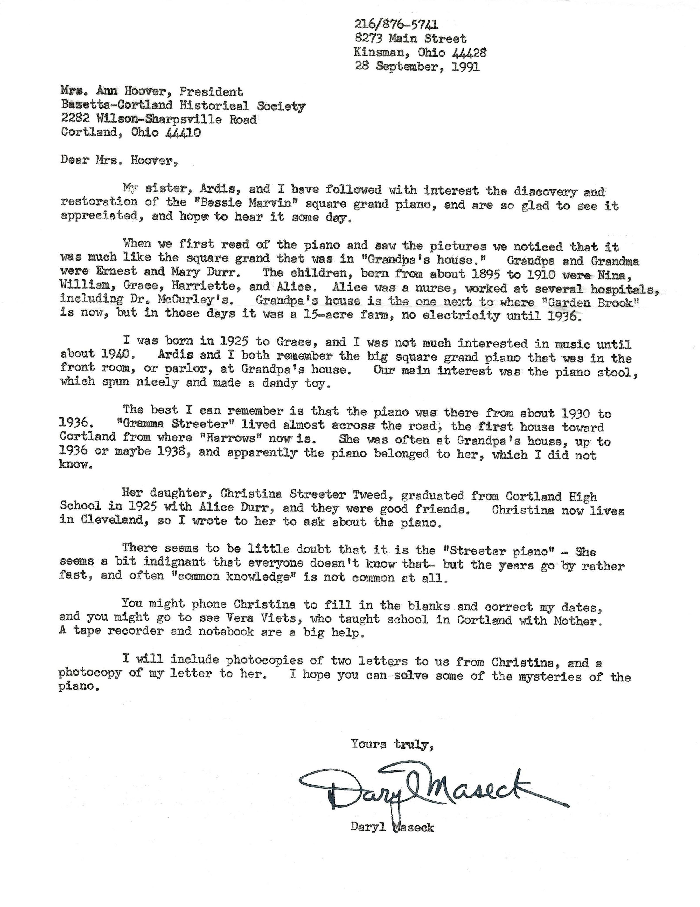 Letter from Daryl Maseck to Ann Hoover about the Bessie Marvin Piano