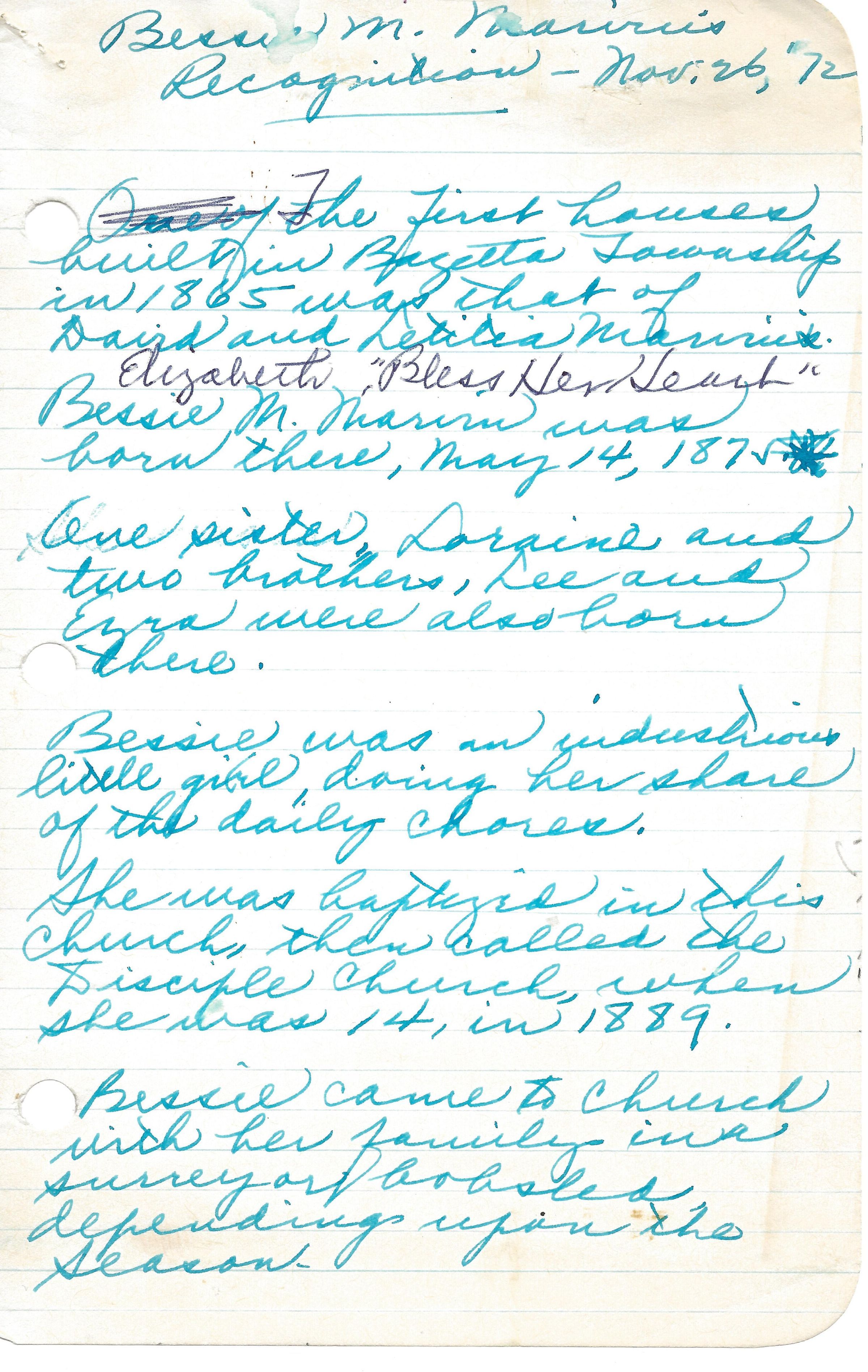 Speaking notes for the Celebration on Nov. 26th 1972 for Bessie Marvin's 97th Birthday