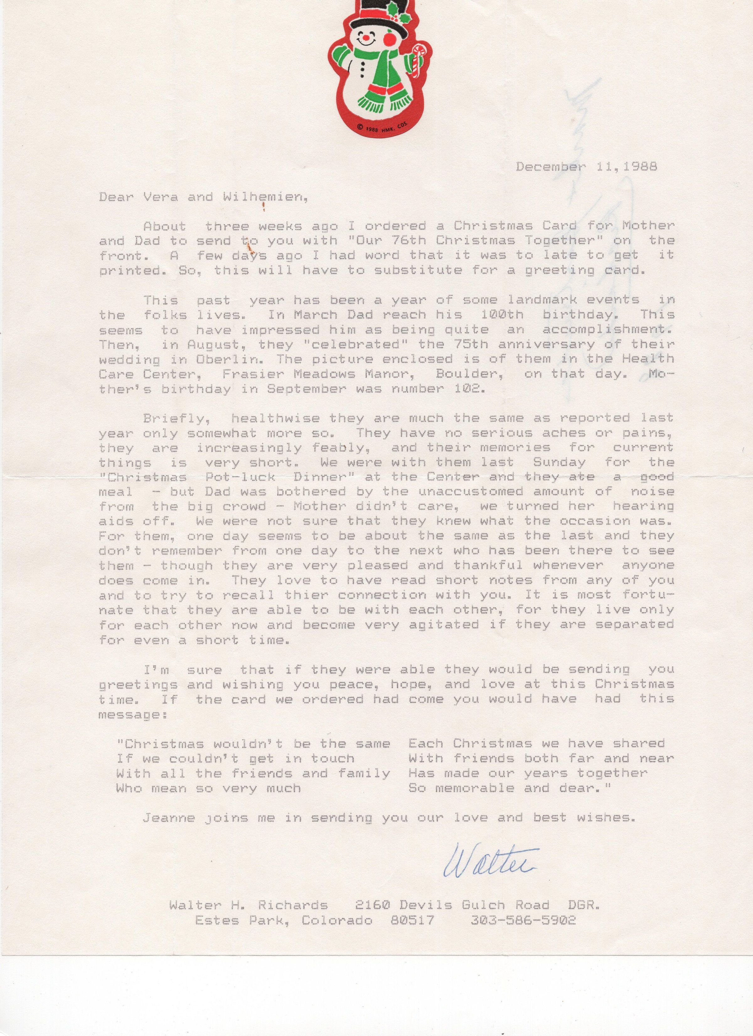 Letter from Walter Richards to the Viets Sisters about Mark and Gertrude Richards 76th ChristmasEntry/Object ID