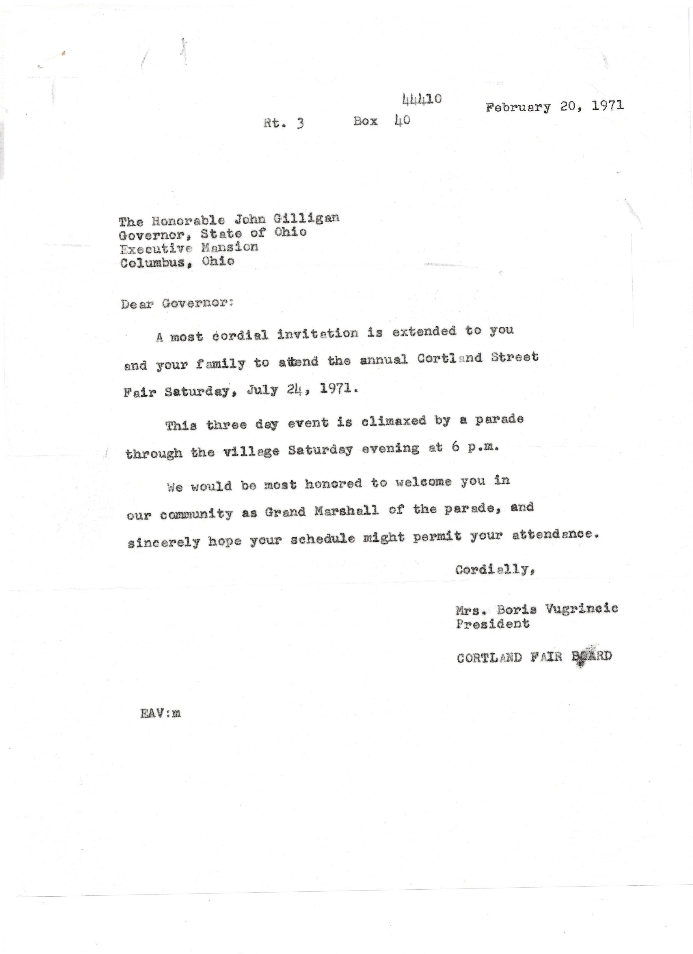Invitation to Governor John Gilligan to attend the 1972 Cortland Street Fair as Parade Grand MarshalCollection