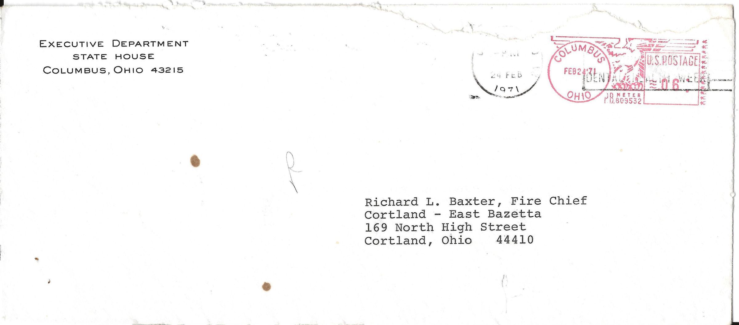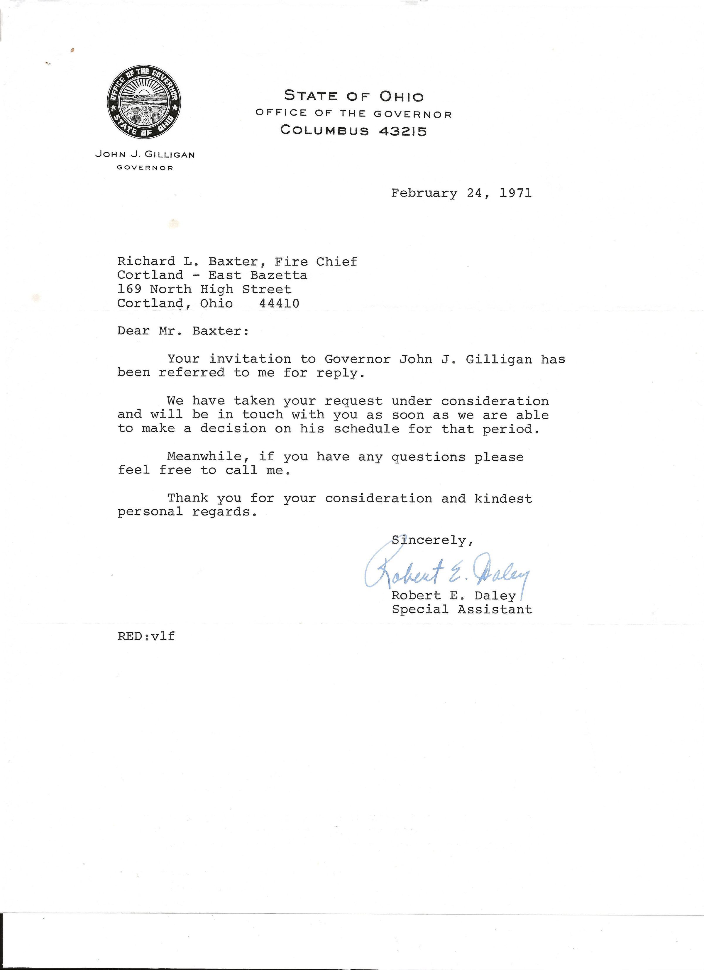 Response to the Fire Chief's request to Governor Gilligan to be Grand MarshalCollection