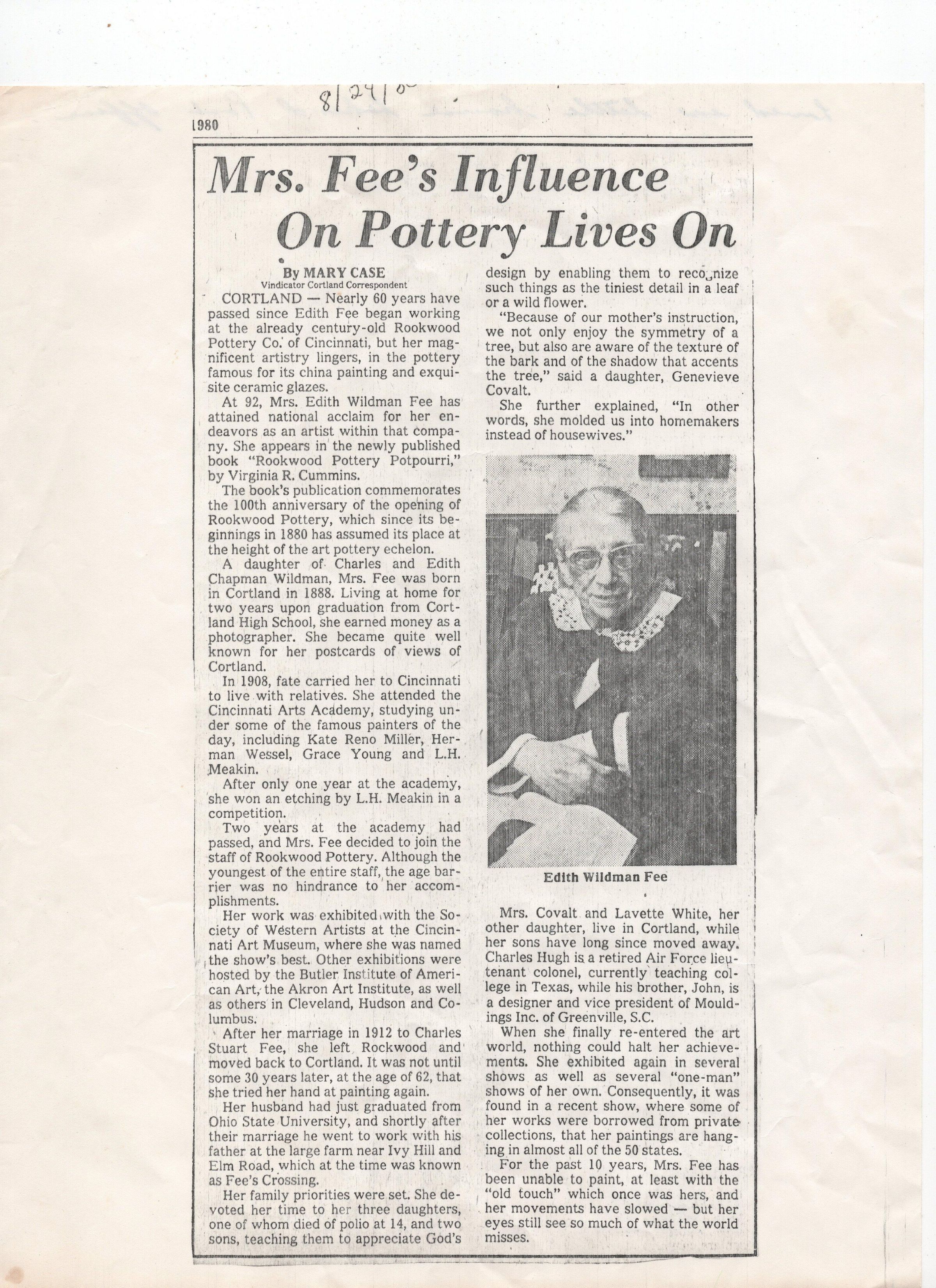 Fee, Edith, Rookwood Pottery Co., Cummins, Virginia R., Wildman, Charles, Wildman, Edith Chapman, Miller, Kate Reno, Wessel, Herman, Young, Grace, Meakin, L.H., Fee, Charles Stuart, Covalt, White, Lavette, Fee, Charles Hugh, Fee, John