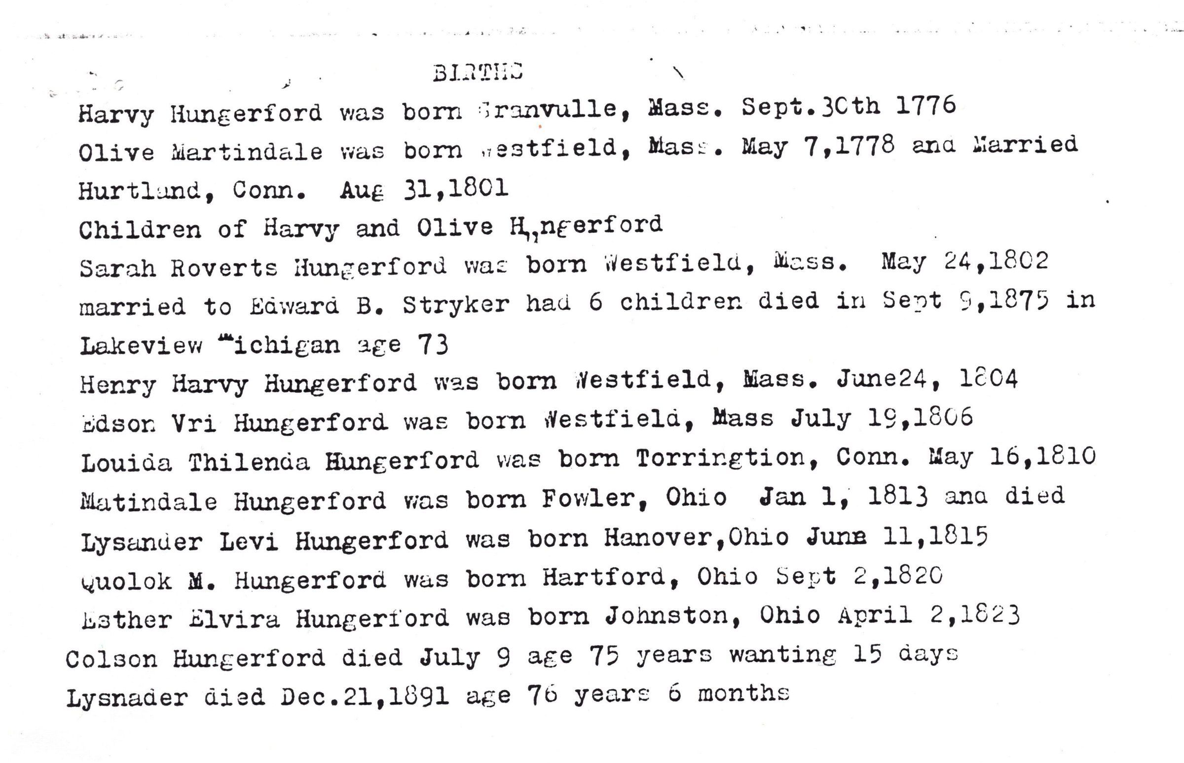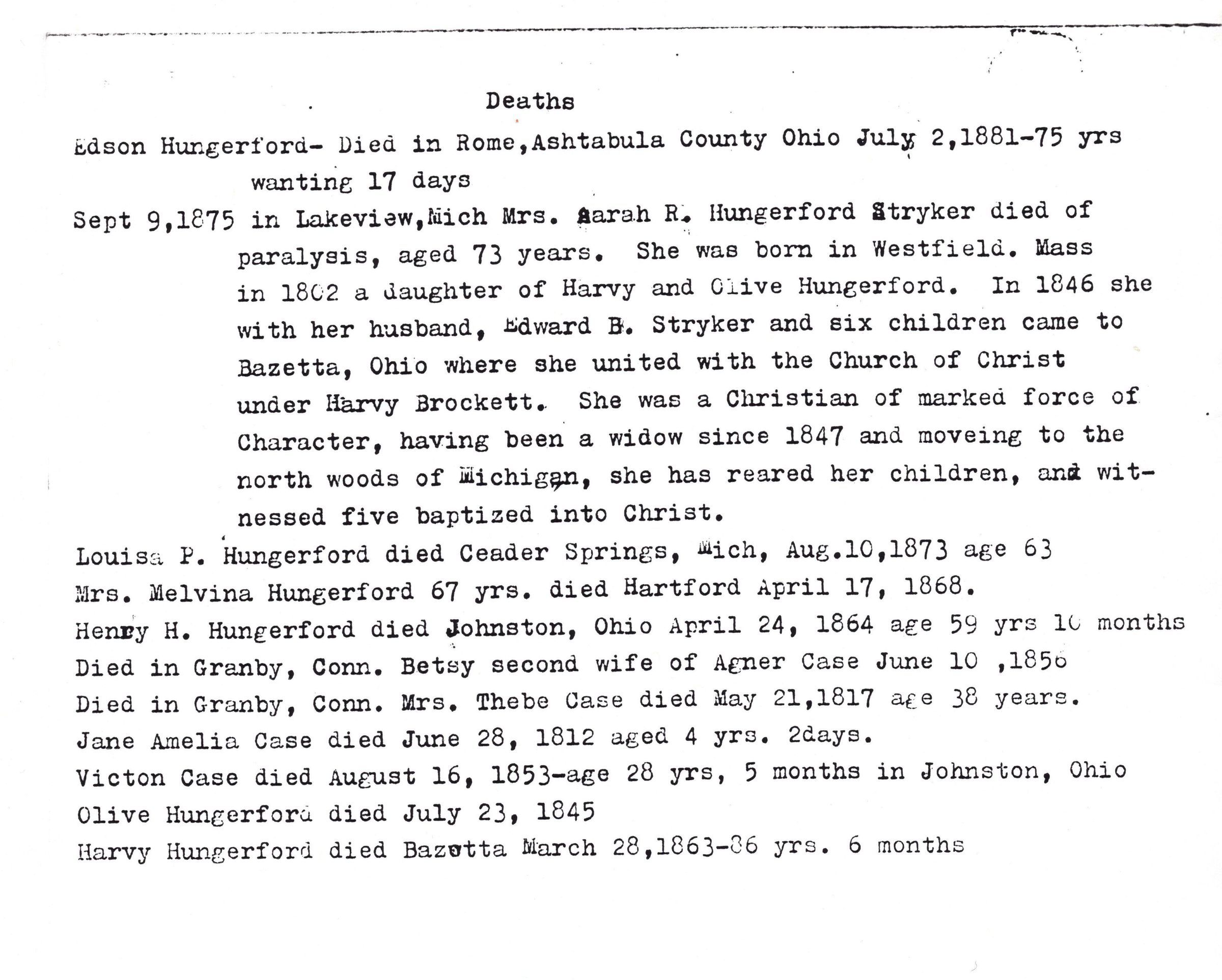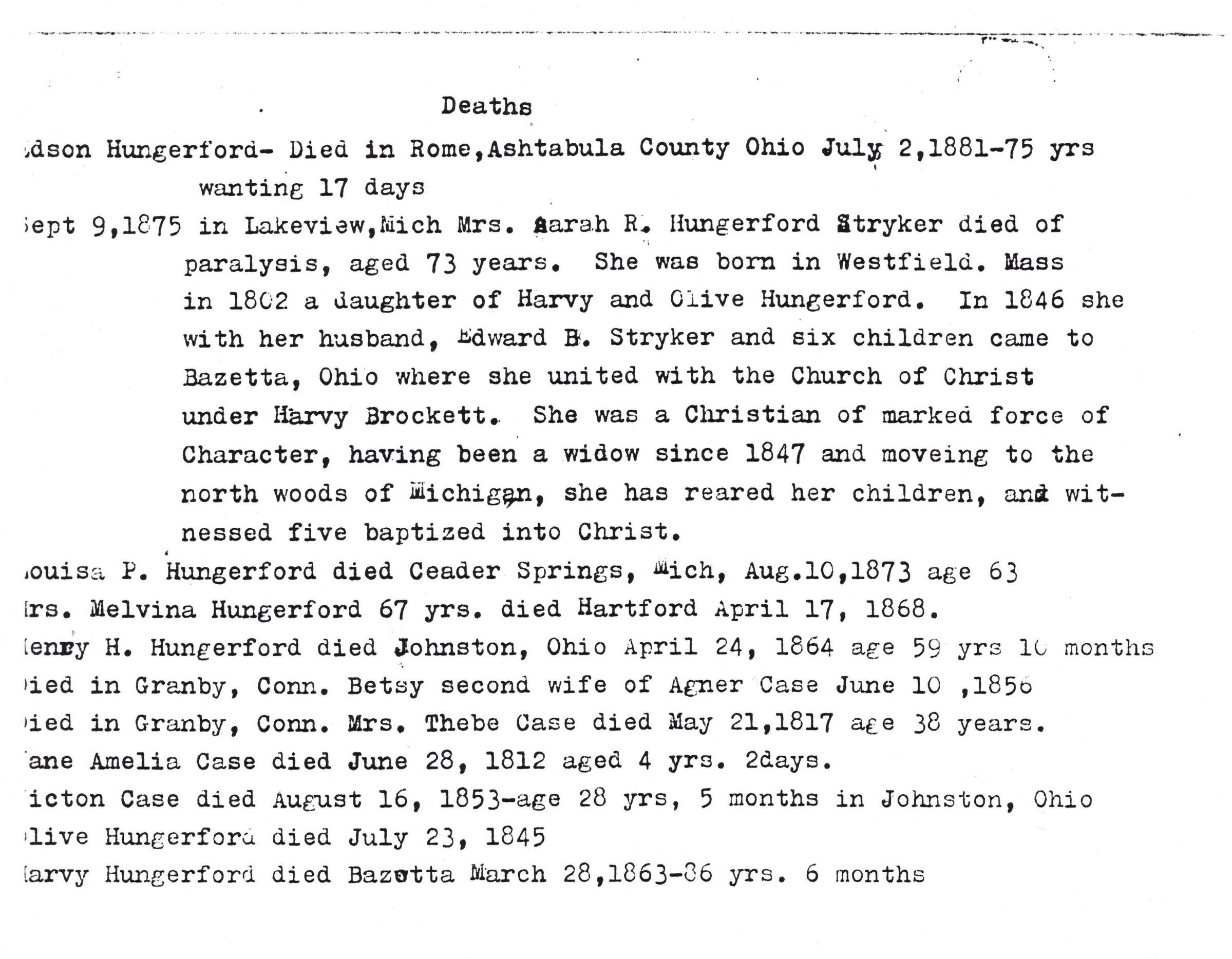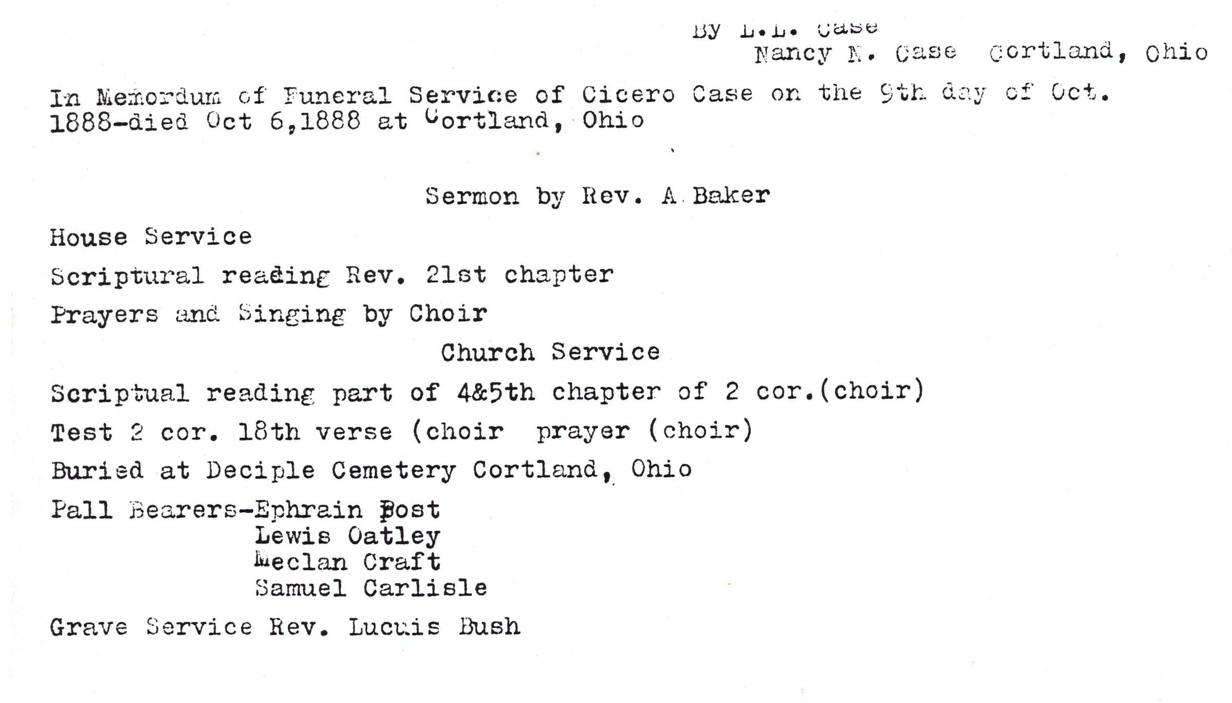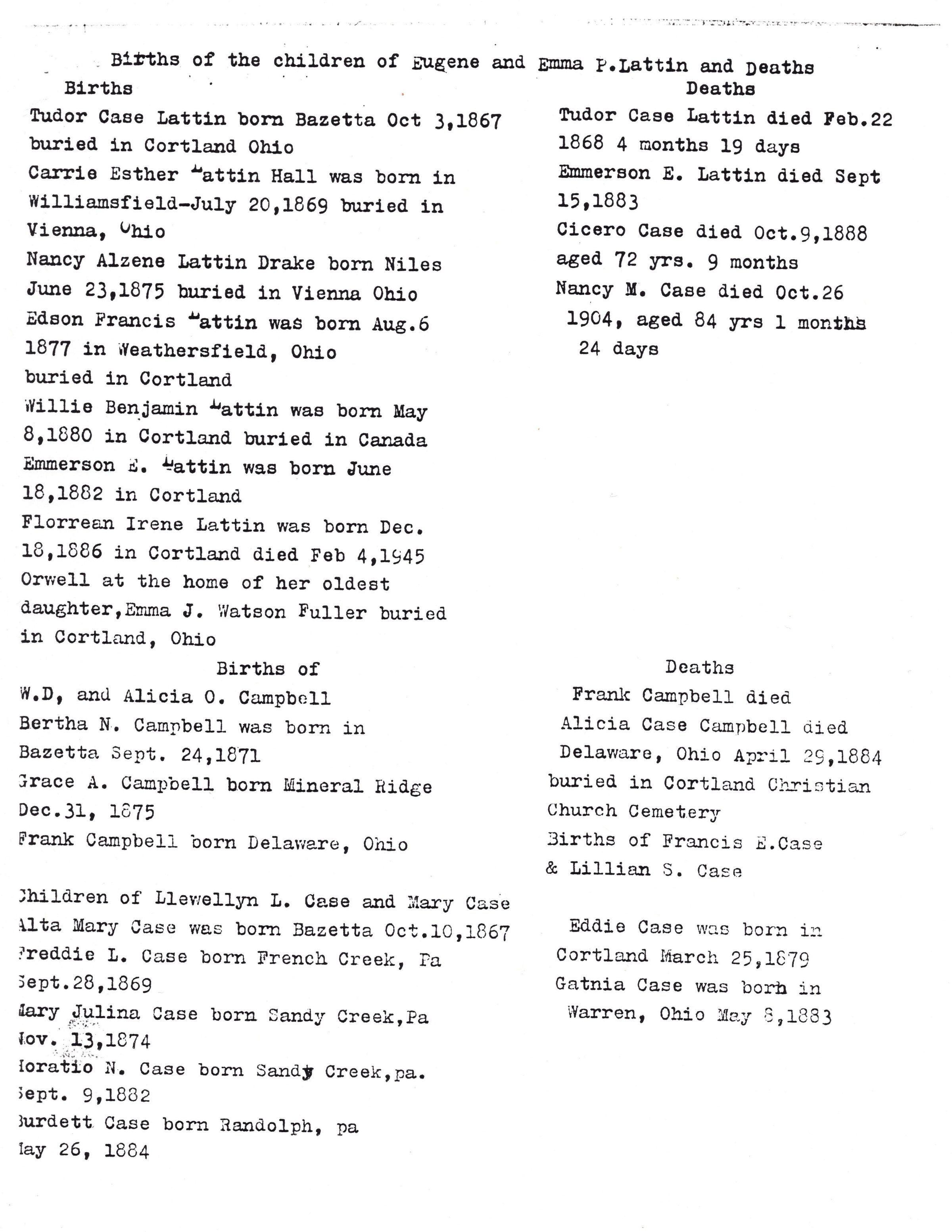 Case, Nancy N., Baker, A., Bush, Lucuis, Oatley, Lewis, Craft, Meclan, Carlisle, Samuel, Post, Ephraim, Hungerford, Sarah R., Hungerford, Olive, Hungerford, Harvy, Stryker, Edward B., Lattin, Tudor Case, Case, Cicero, Campbell, Frank, Campbell, Alicia Case