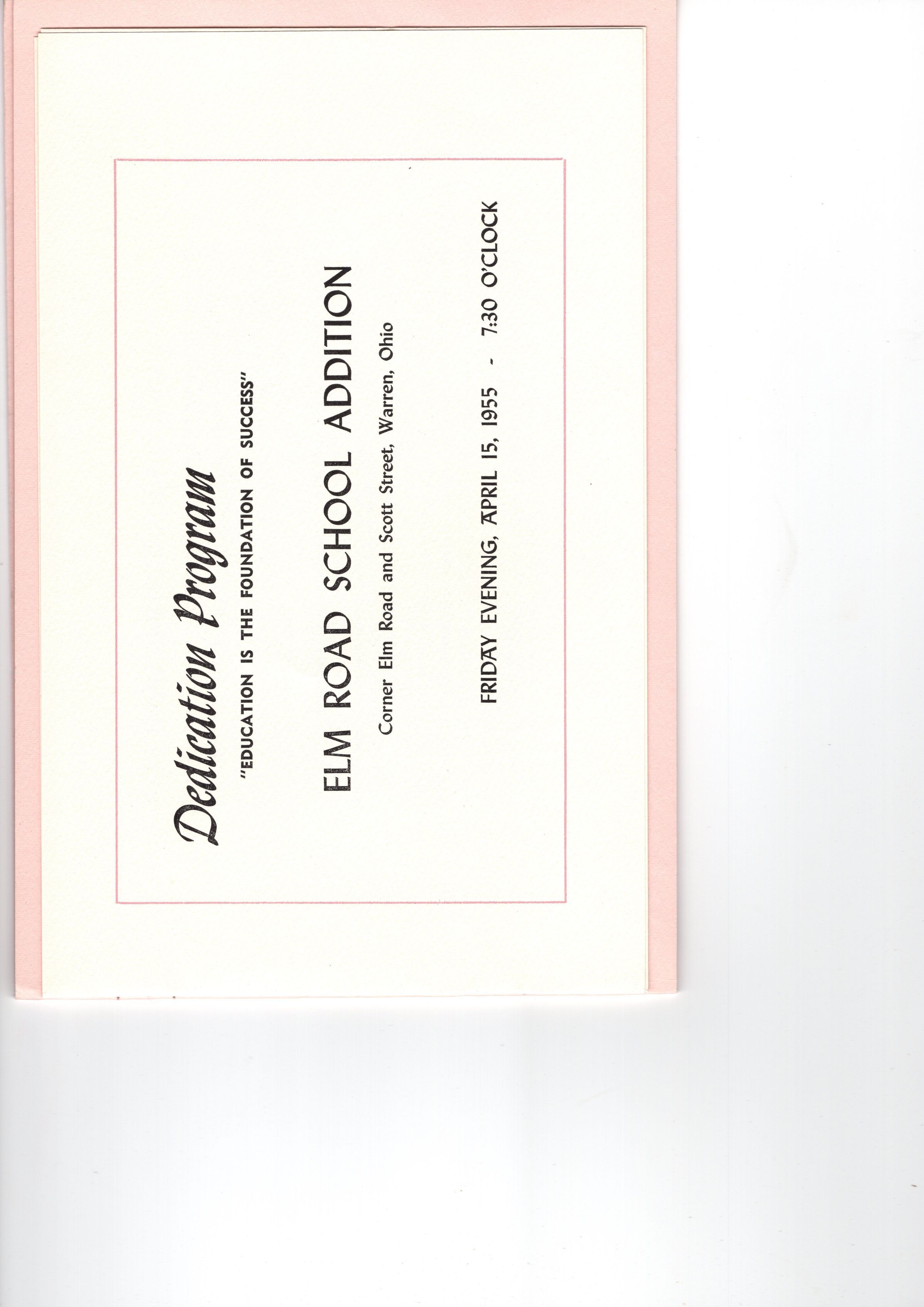 Dedication program for the Elm Road School Addition on Corner Elm Road and Scott Street, Warren, Ohio on April 15, 1955 at 7:30pmCollection