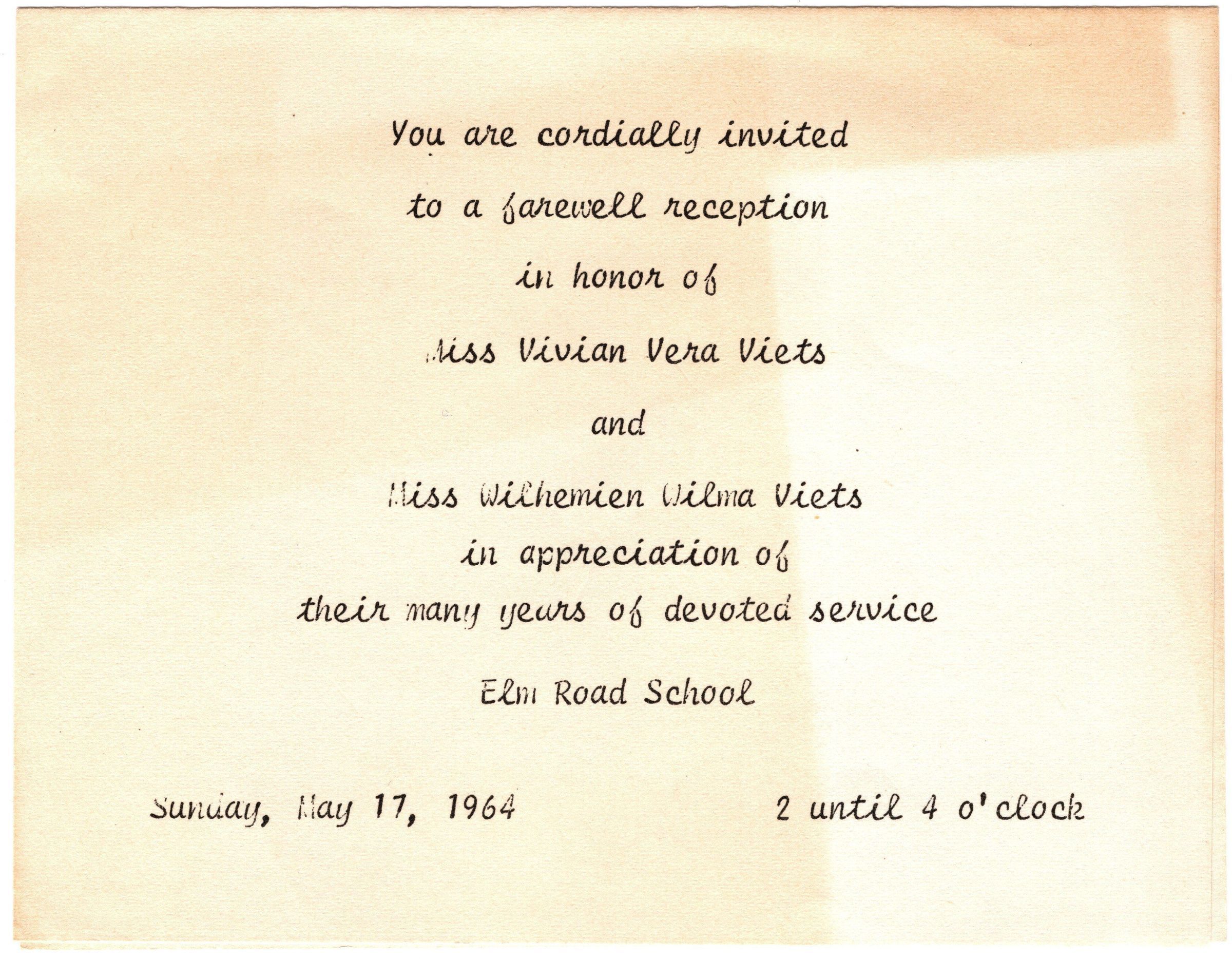 Invitation for farewell Reception for the Viets sistersEntry/Object ID