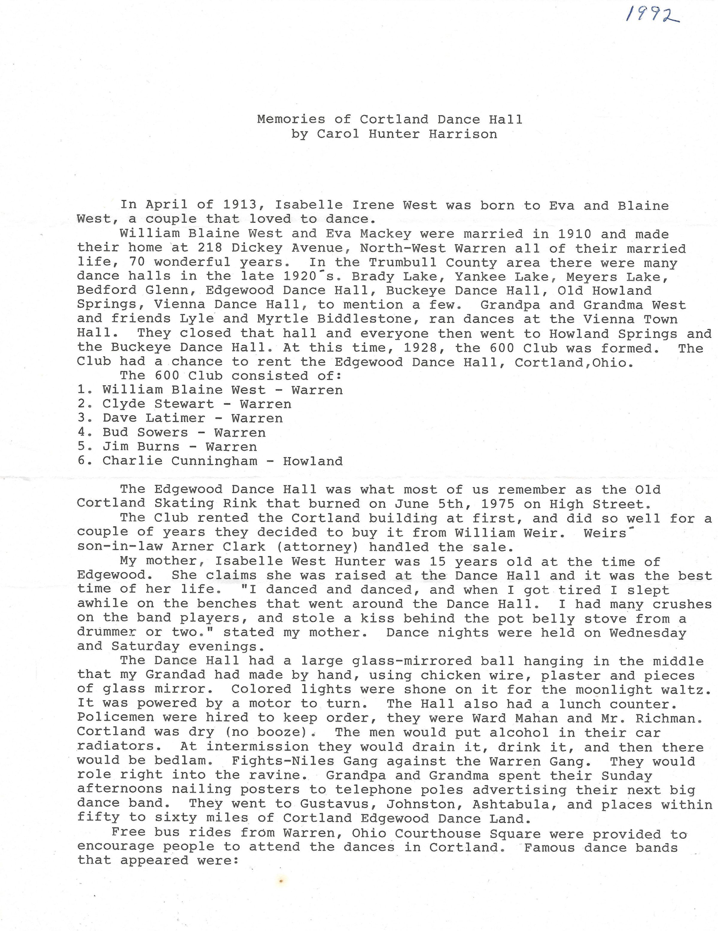 Harrison, Carol, West, Isabelle Irene, West, Eva, West, Blaine, Mackey, Eva, Stewart, Clyde, Latimer, Dave, Sowers, Bud, Burnes, Jim, Cunningham, Charlie, Edgewood Dance Hall, Weir, William, Clark, Arner, Mahan, Ward, Richman, Whitman, Paul, Shaw, Artie, Lambardo, Guy, Perkins, Doc, Gill, Emerson, O'Brian, Pat, Kipple, Fred, Manning, Tom, Spevak, Charlie