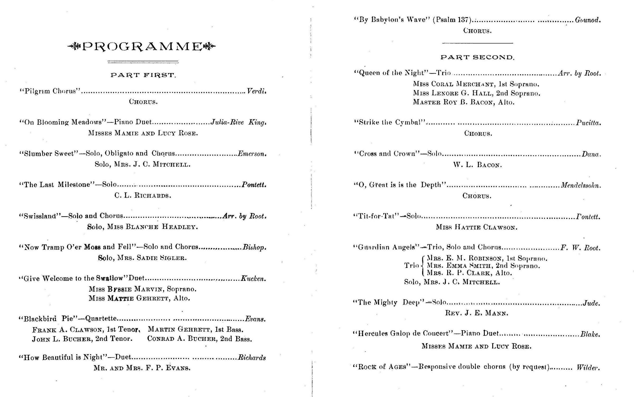 Robinson, J. H., Rose, Lucy, Rose, Mamie, Mitchell, J. C., C. L Richards, Headley, Blanch, Sigler, Sadie, Marvin, Bessie, Gehrett, Mattie, Clawson, Frank, Gehrett, Martin, bucher, John, Bucher, Conrad, Evans, F. P., Merchant, Coral, Hall, Lenore, Bacon, Roy, Bacon, W. L., Clawson, Hattie, Robinson, E. M., Smith, Emma, Clark, R. P., Mitchell, J. C., Mann, J. E.
