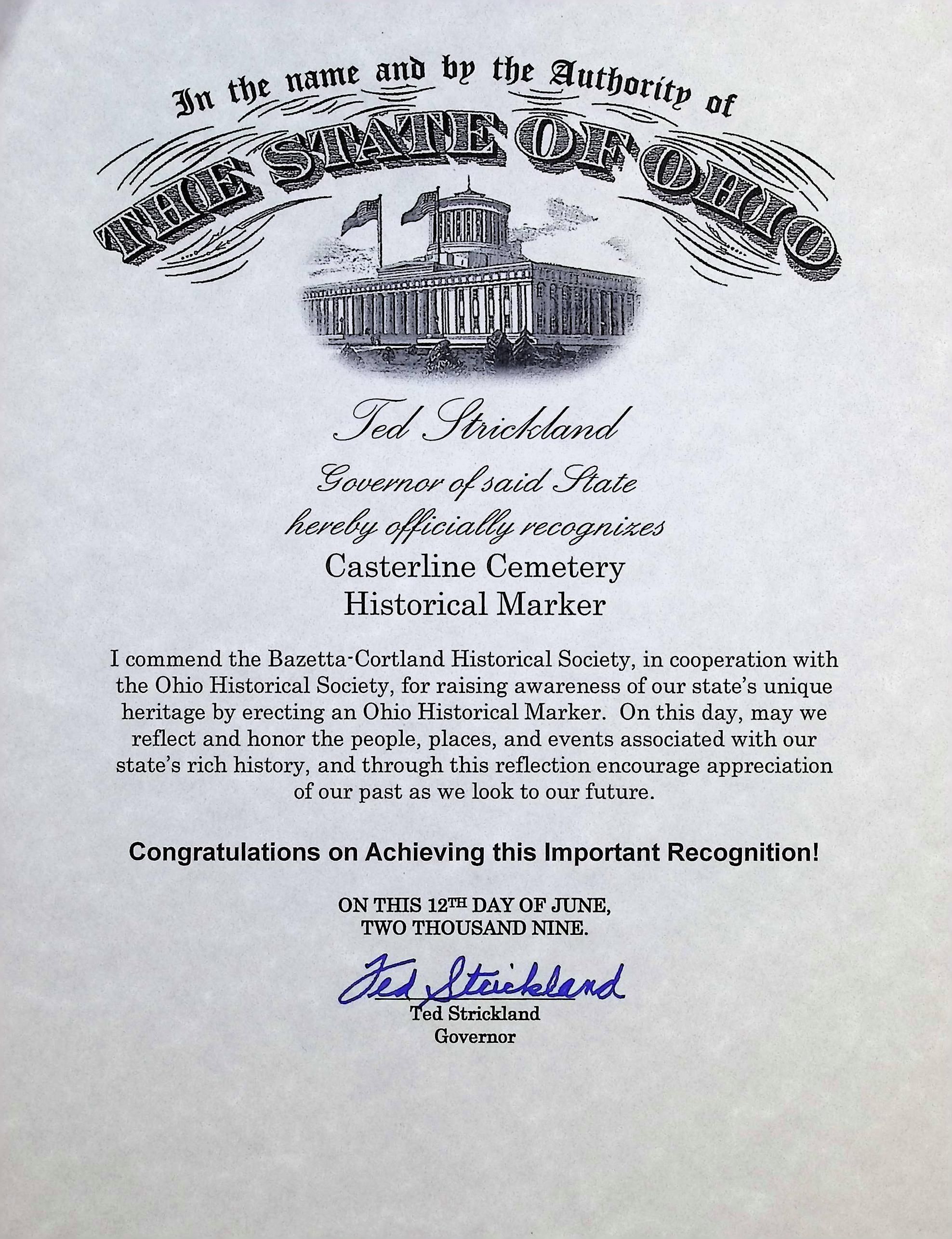 governor Ted Strickland recognition of Casterline Cemetery MarkerEntry/Object ID