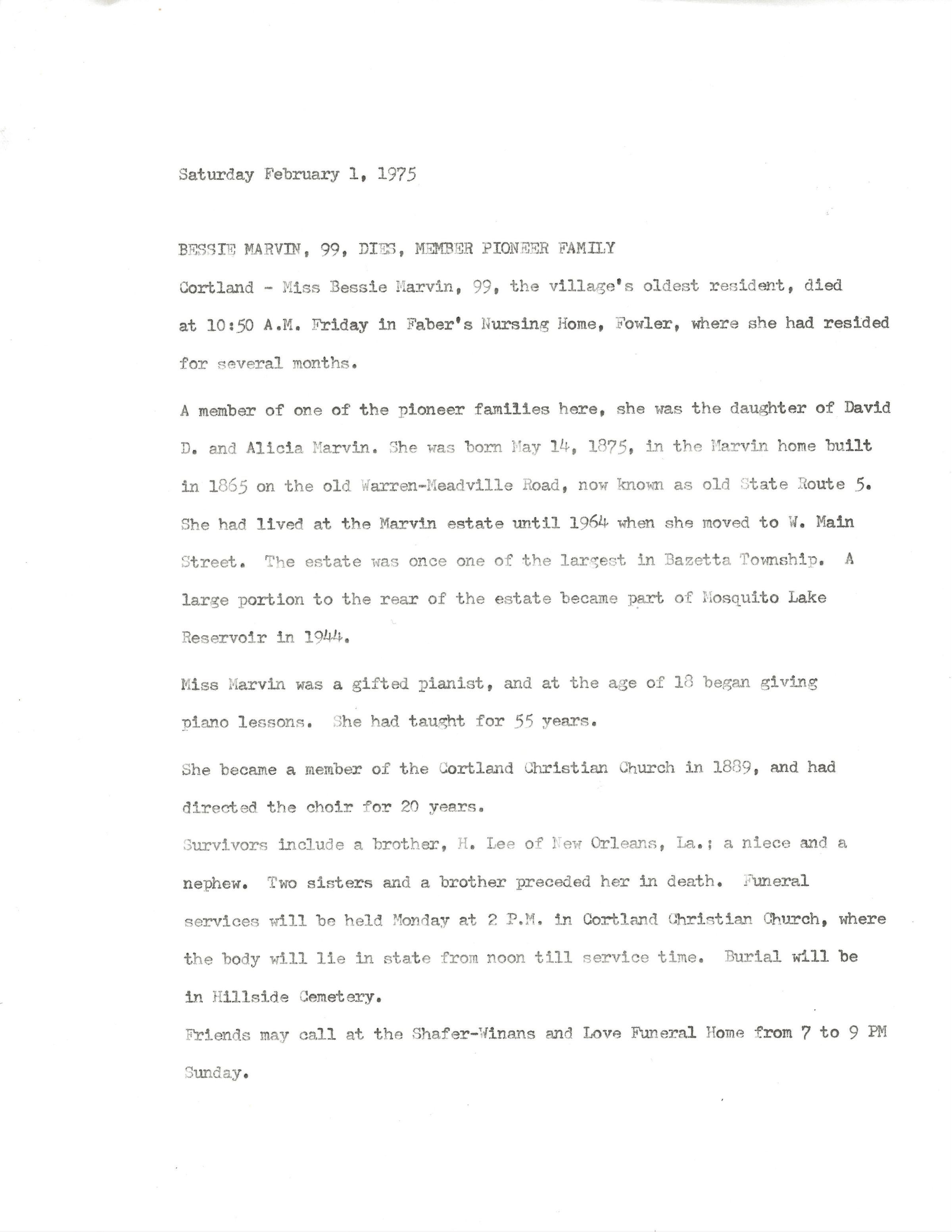 Typed copy for Bessie Marvin Obituary February 1, 1975Collection
