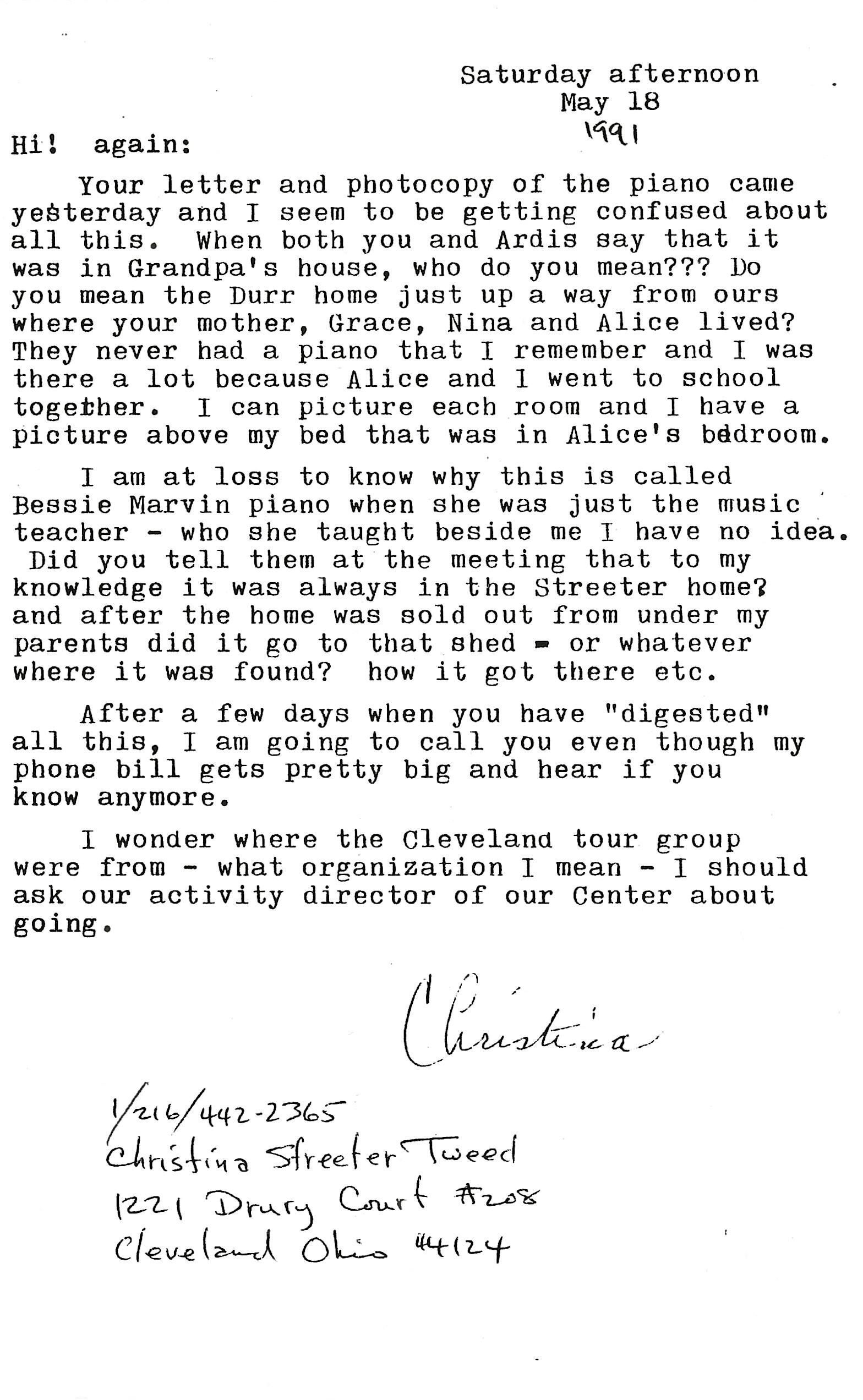 Note from Christina Streeter Tweed - Bessie Marvin Student - Dated May 18, 1991 Discussing the Location of the Piano as she remembered seeing it.Collection