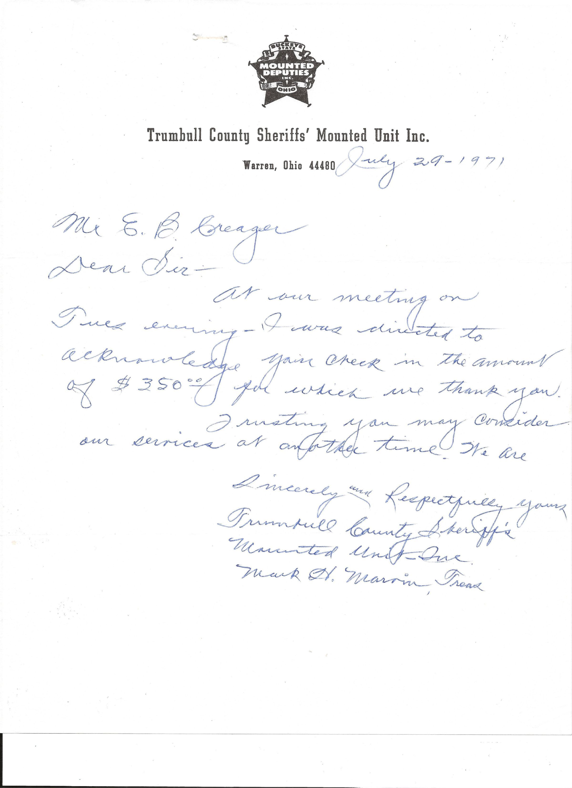 Thank you note from Trumbull County Sheriffs' Mounted Unit, Inc.Entry/Object ID
