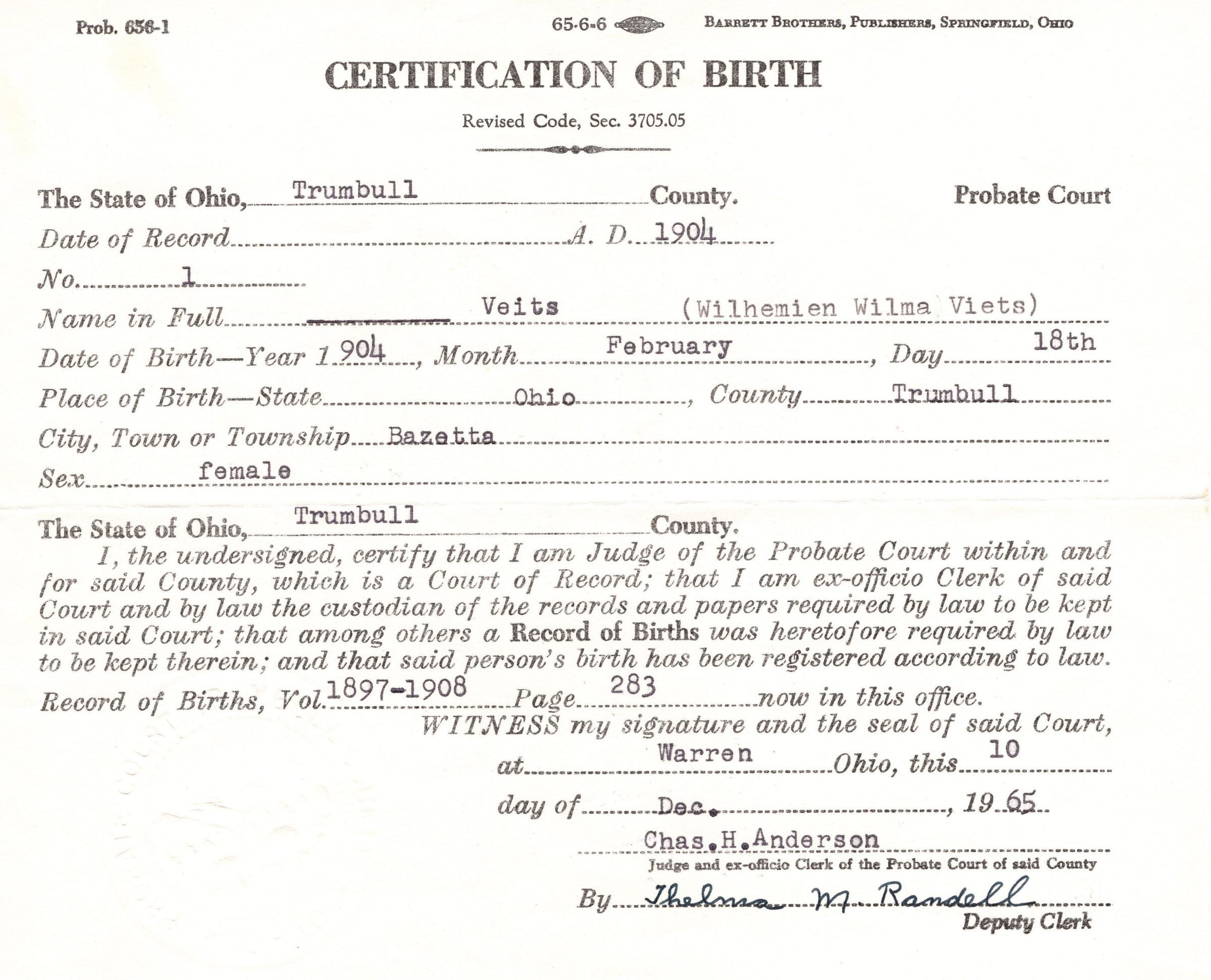 Wilhemiein Viets Certificate of Birth 1904Collection