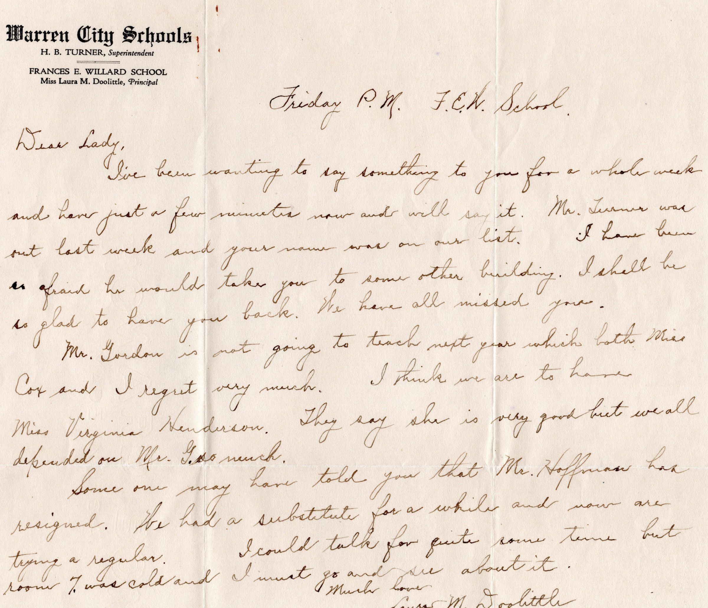Letter from Laura M. Doolittle Principal Willard SchoolEntry/Object ID