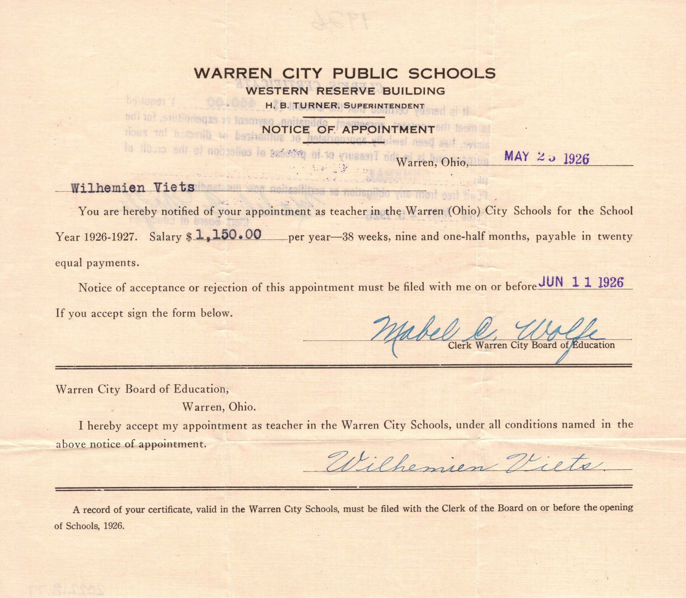 Wilhemien Viets Notice of appointment Warren City Public Schools 1926Collection