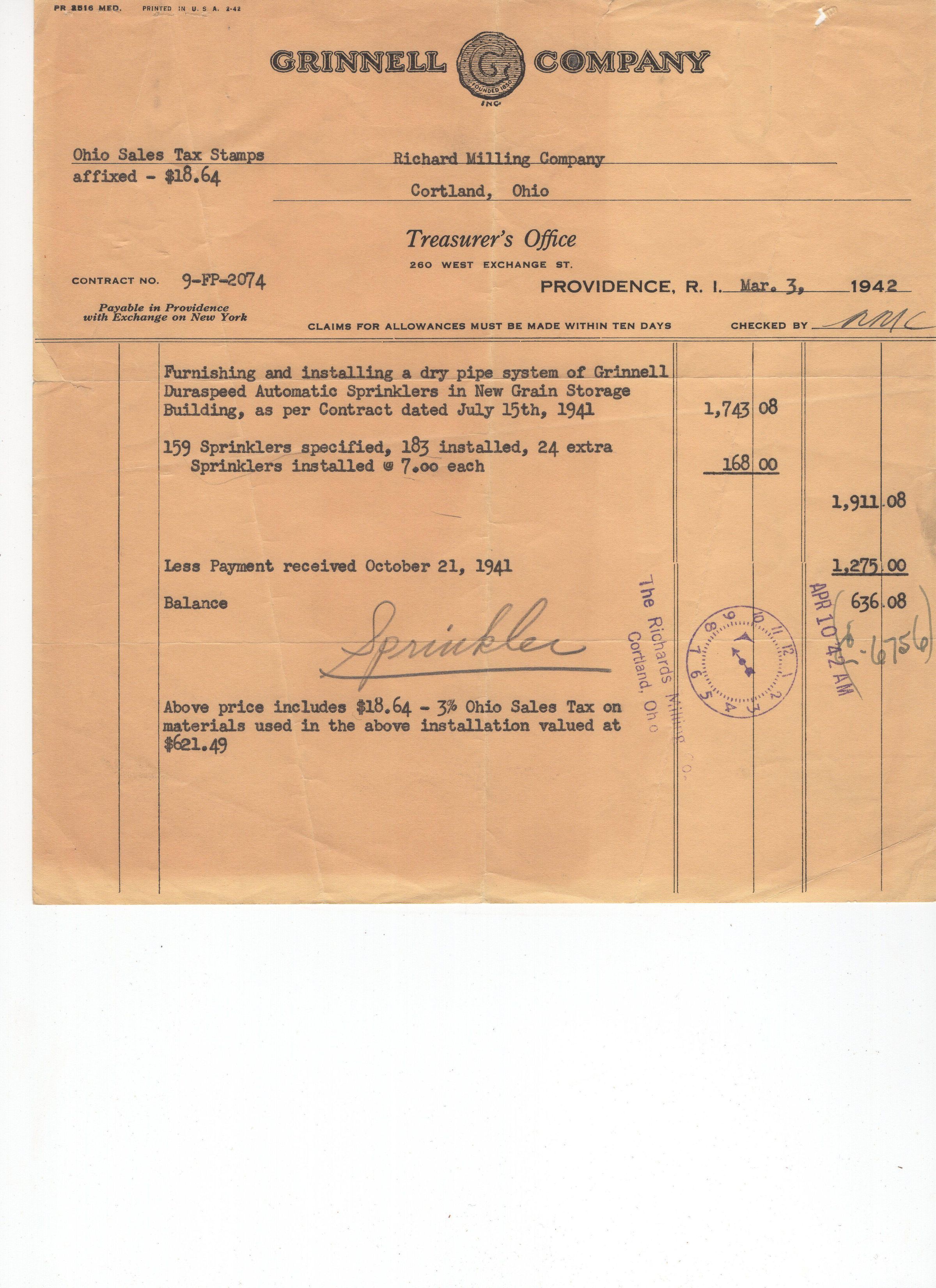 Invoice for dry pipe sprinkler System for the Richards Milling Co. from the Grinnell CompanyCollection