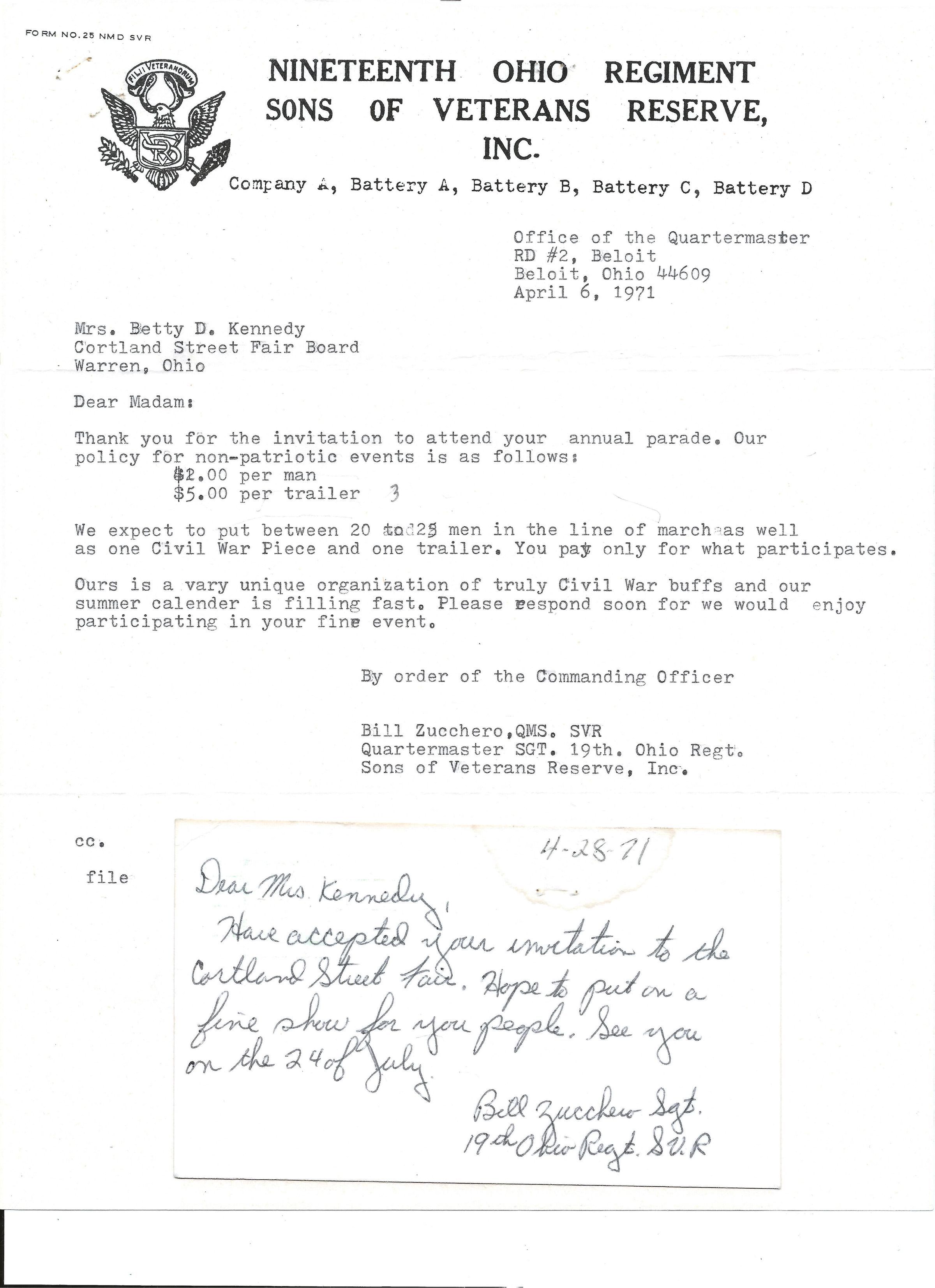 Proposal to the Street Fair Board from the Nineteenth Ohio RegimentCollection
