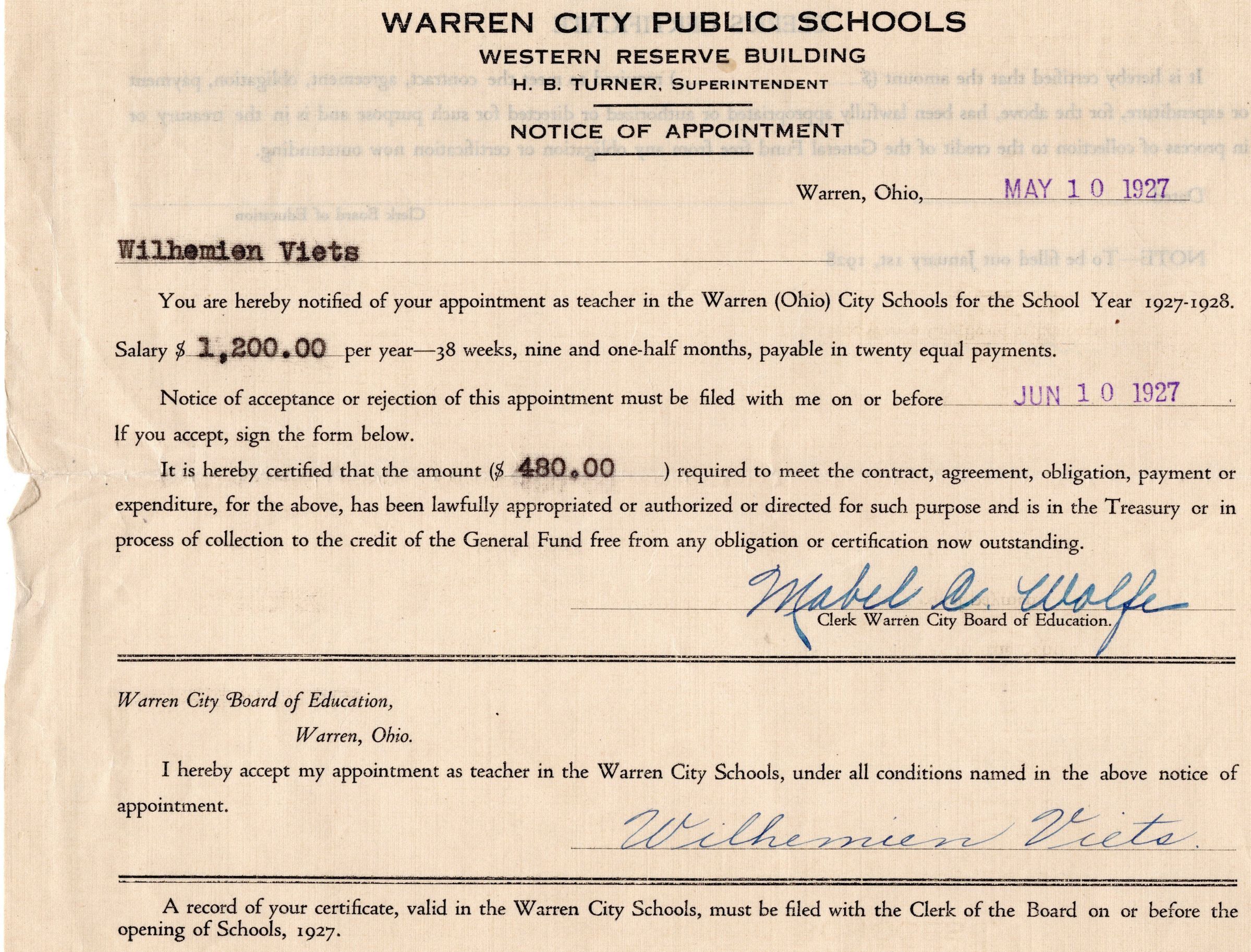 Wilhemien Viets Notice of appointment 1927Collection