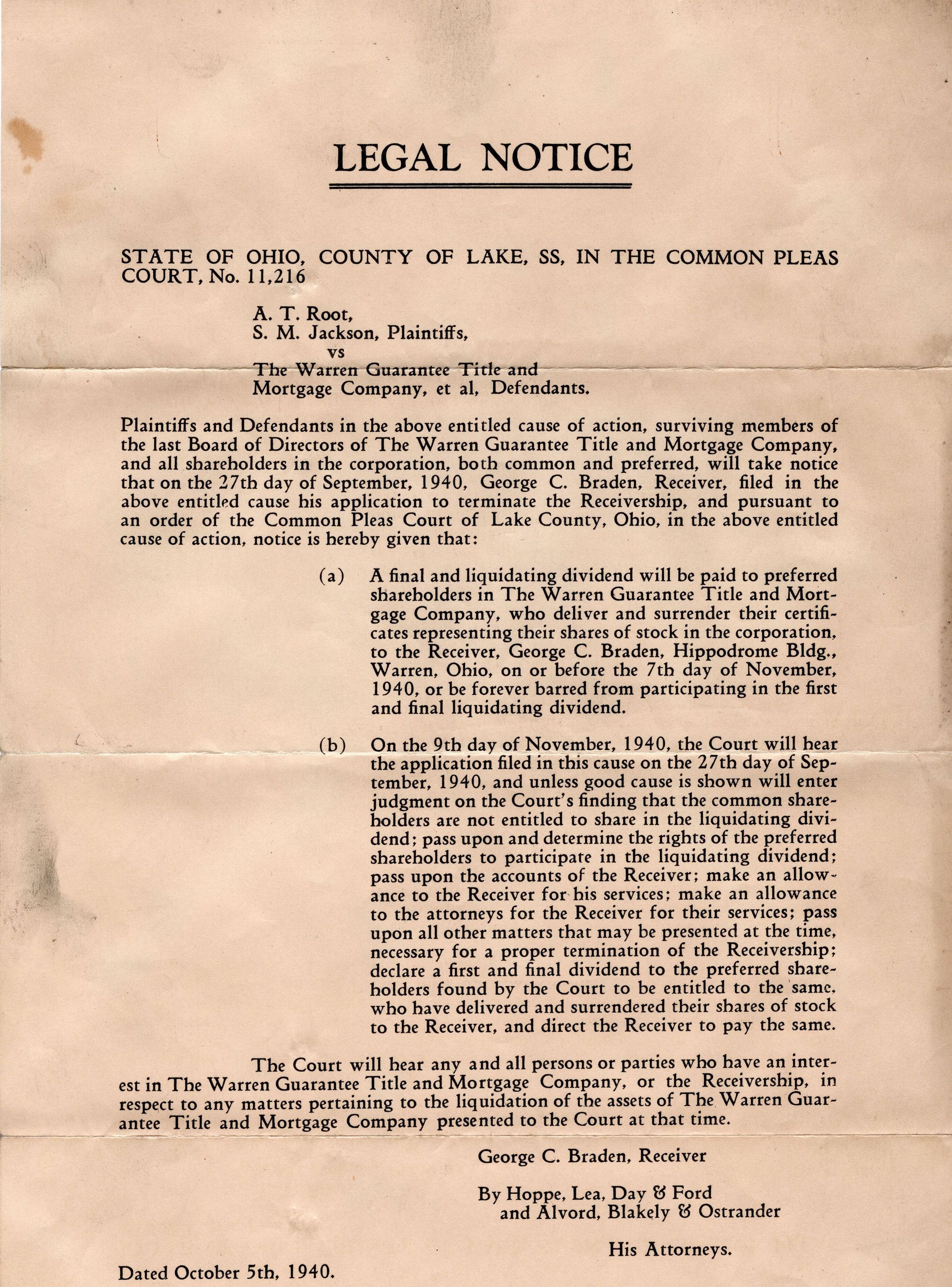 Common Pleas Court notice of Settlement of Receivership of The Warren Guarentee Title and Mortgage Company