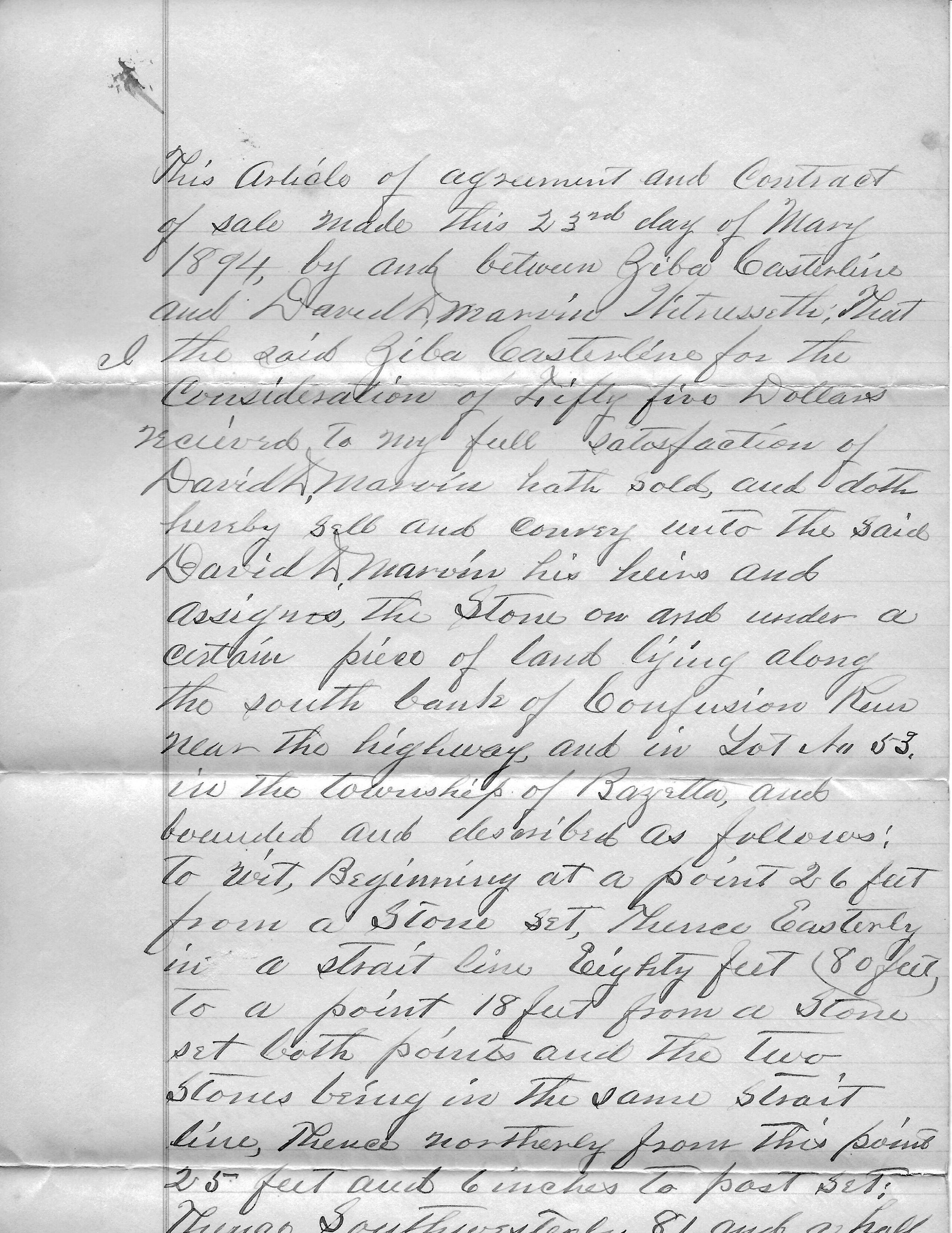 An agreement to purchase stone between David Marvin and Ziba Casterline in 1894 Probably to construct the Marvin house.Collection