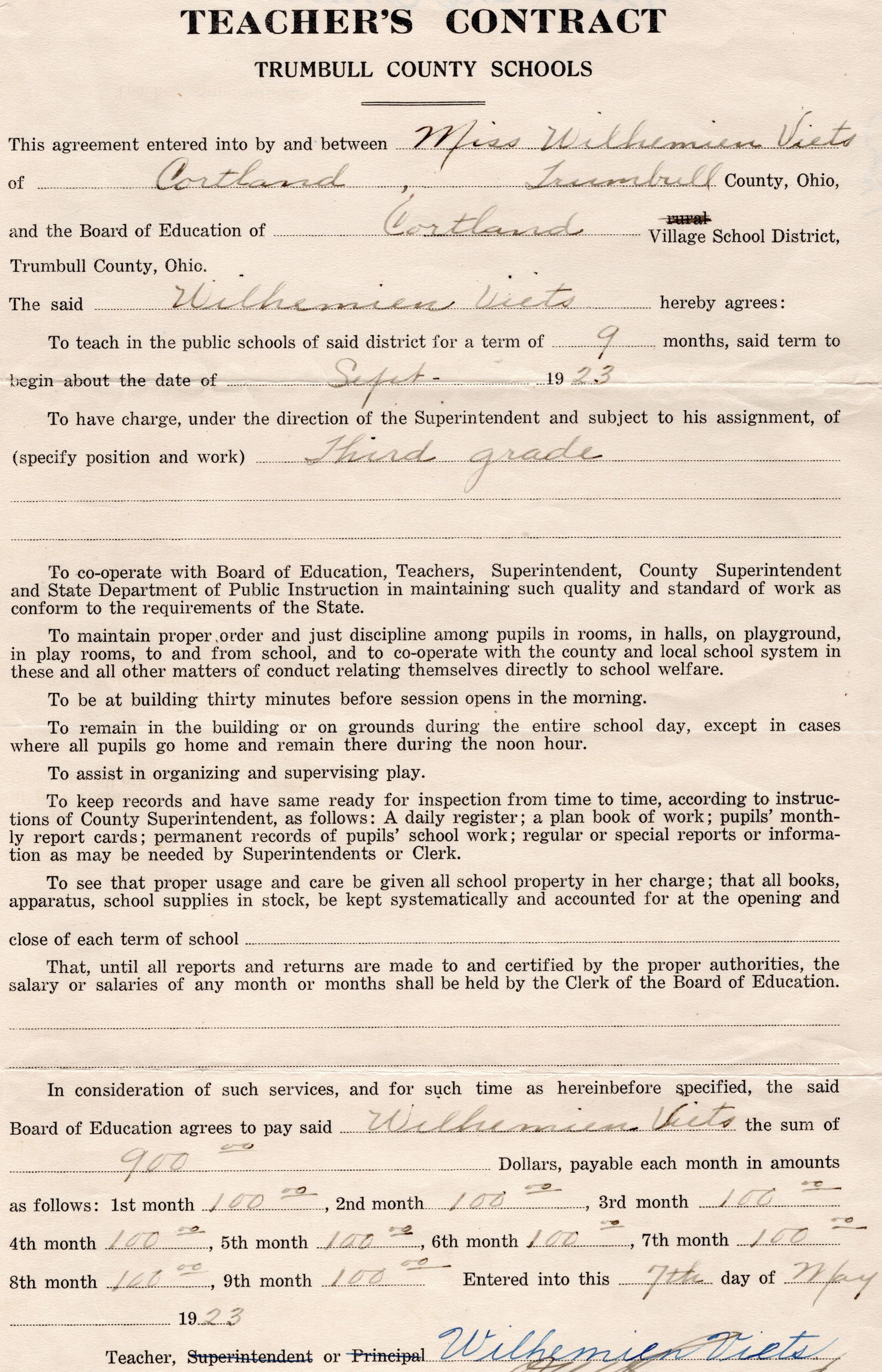 Wilhemien Viets Teacher's Contract 1923Entry/Object ID