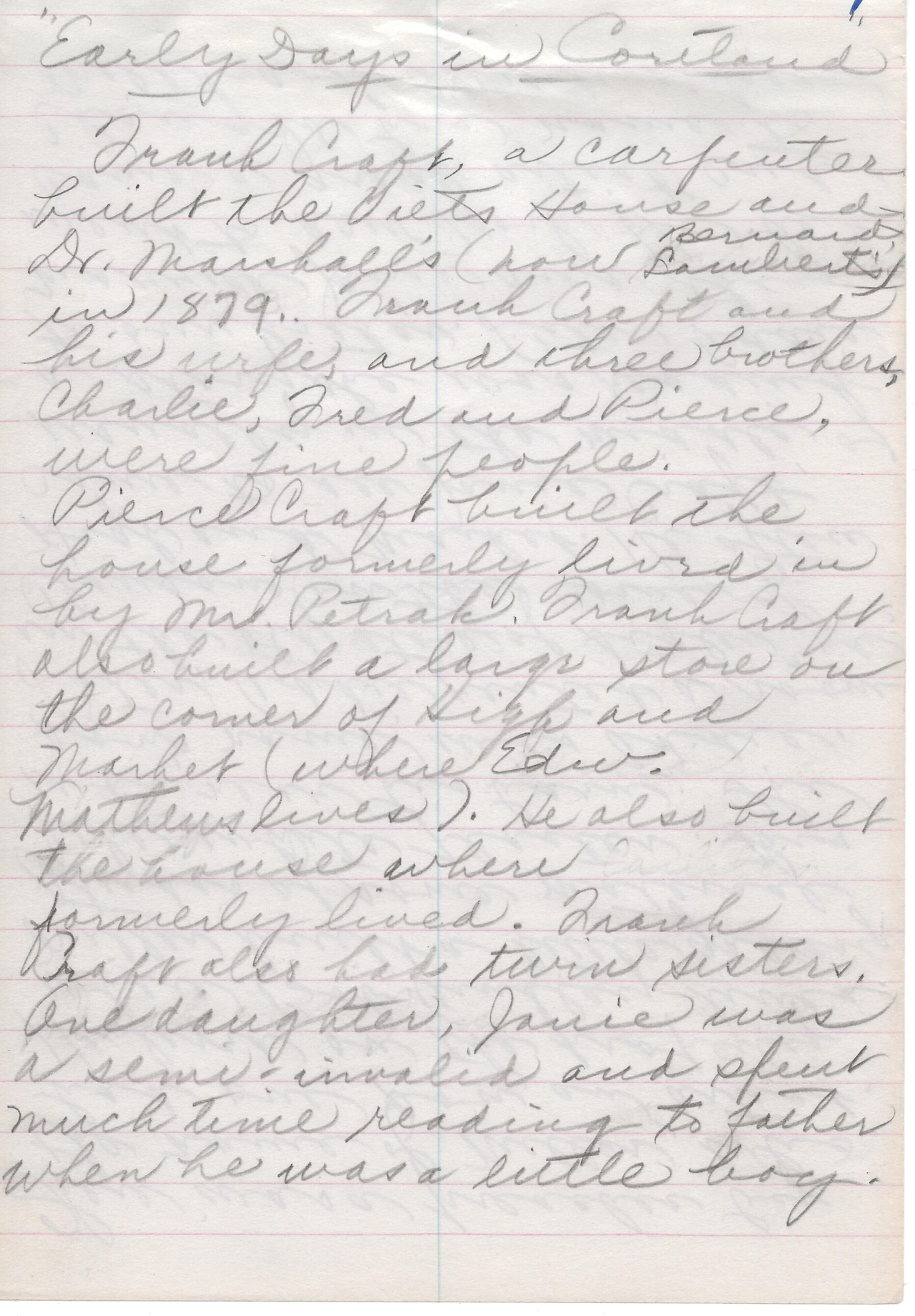 Early Days in Cortland - Transcribed by Vera Viets - This may have been from discussions with her parents and is 44 pages in length.