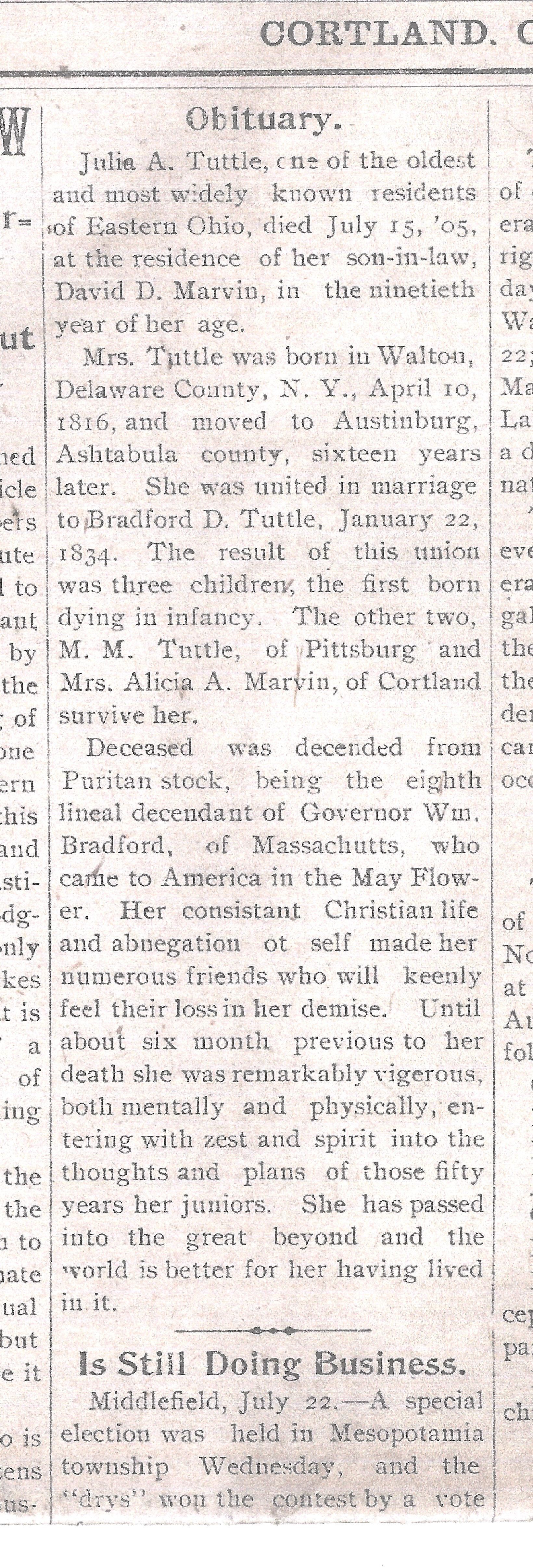 Obituary of Julia A Tuttle from the Cortland Herald July 28, 1905