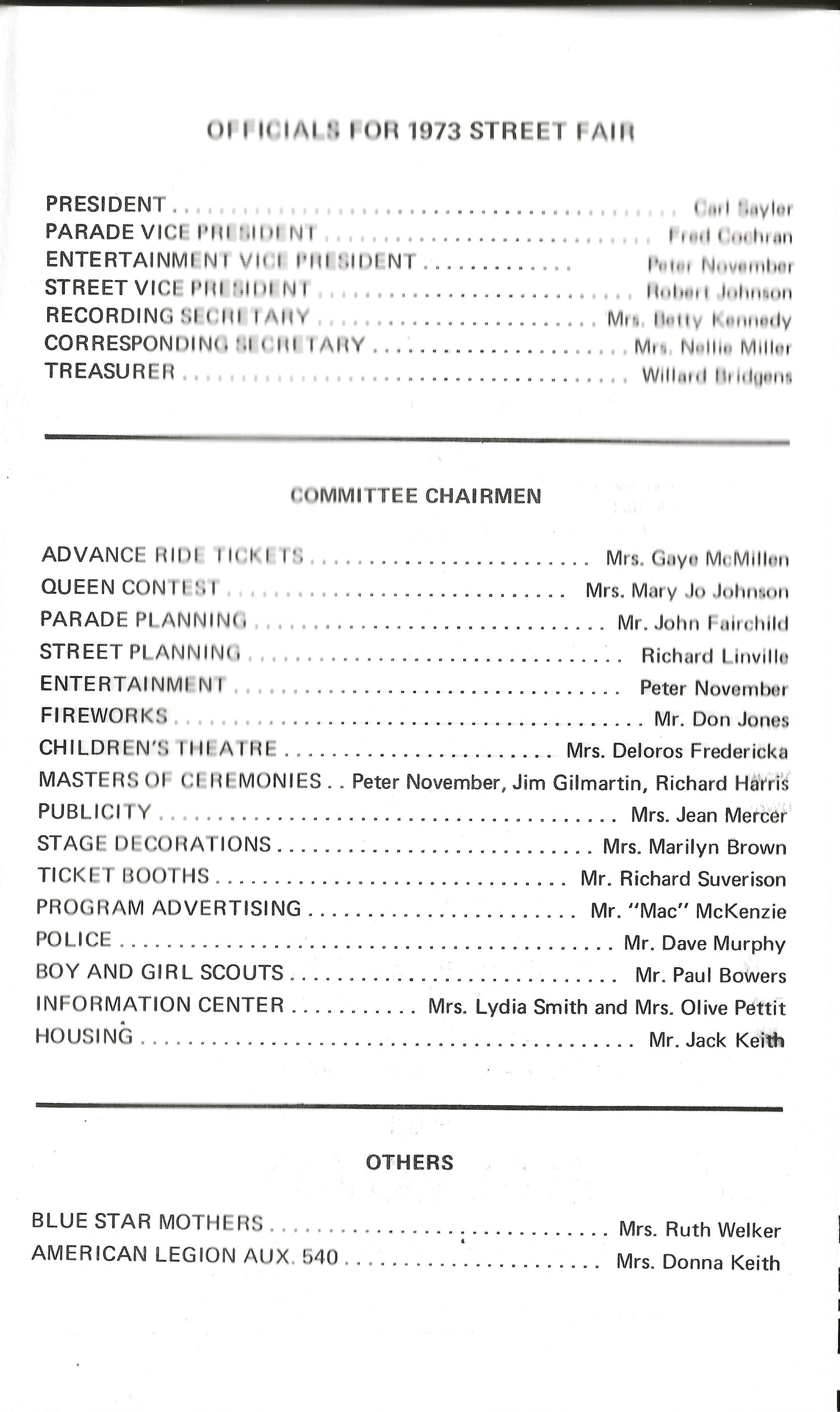 Sayler, Carl, Cochran, Fred, kennedy, Betty D., Bridgens, Willard, miller, Nettie, Johnson, Robert, Linville, Richard, Harris, Richard, McMillen, Gaye, Johnson, Mary Jo Hall, Fairchild, John, November, Peter, Jones, Donald, Fredricka, Delores, Gilmartin, Jim, Mercer, Jean, Suverison, Richard, McKenzie, Mac, Murphy, David H., Bowers, Paul, Keith, Jack, Pettit, Olive, Smith, Lydia, Keith, Donna, Welker, Ruth, Hitchcock, Olga