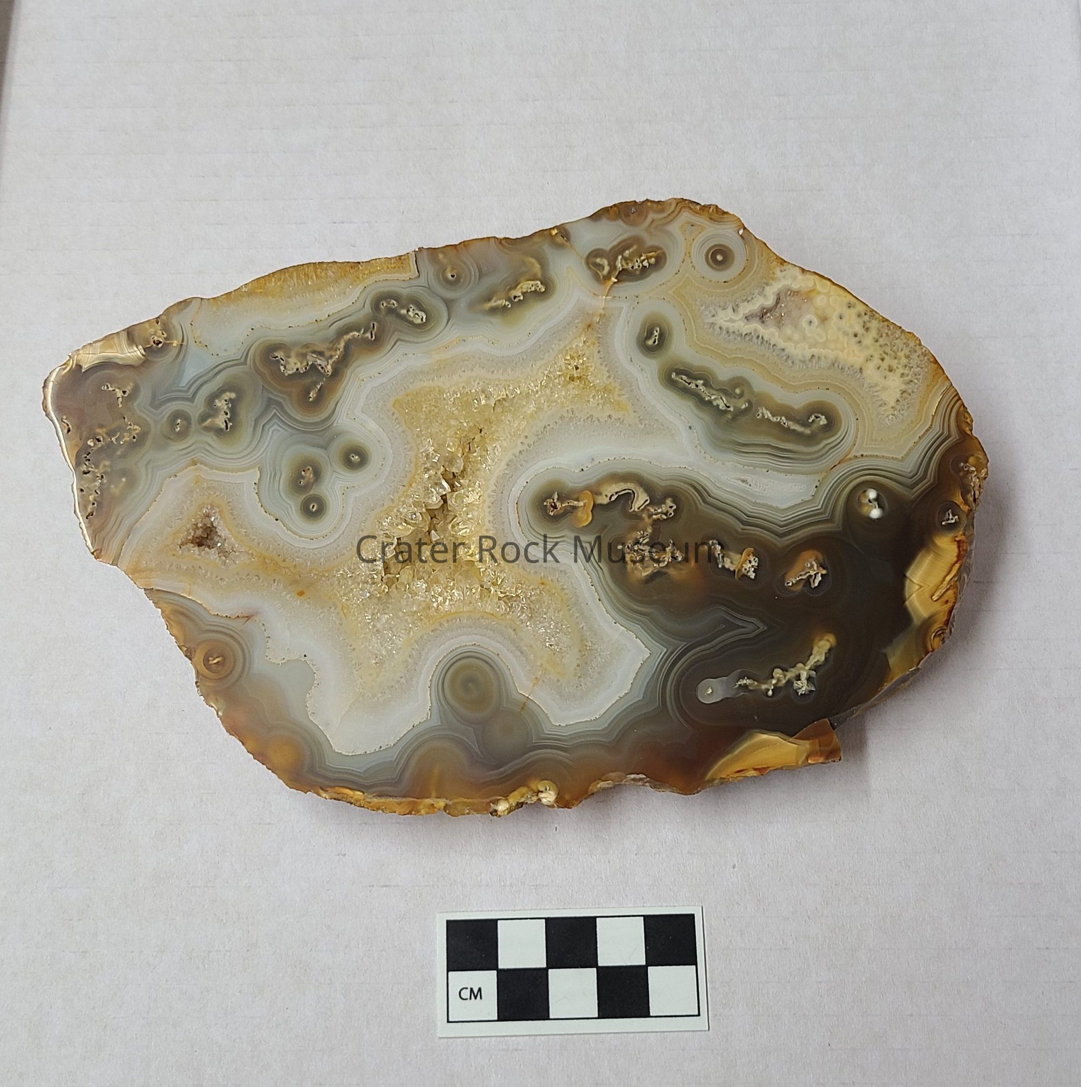 An Agate from Brazil. Polished side shows large Crystalline areas in Yellows surrounded by fortified areas in White Crystalline, Pale Grey, Olives, Browns and Gold with Grey Moss inclusions. Evidence of Stalactites seen.Dimensions