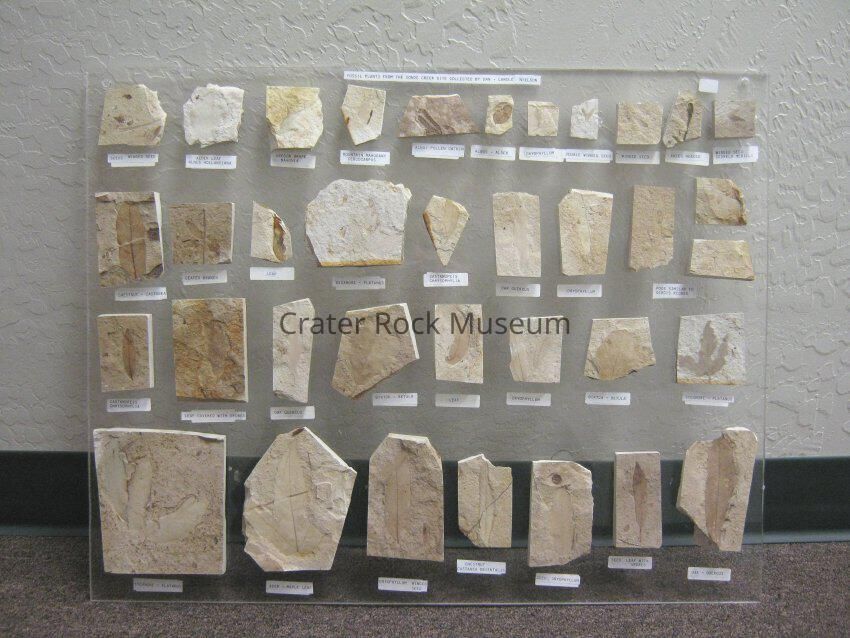 36 plant fossils glued to a plexiglass board. Mostly consisted of leaves and seeds.
