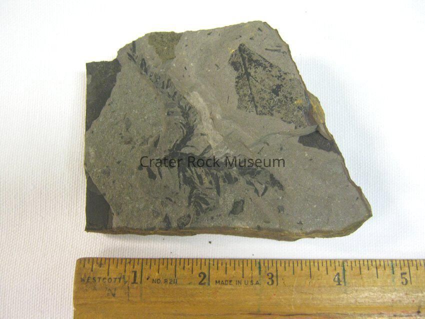 Two connected branches of Sequoia needles, carbonized and black in color, on a pale grey matrix.