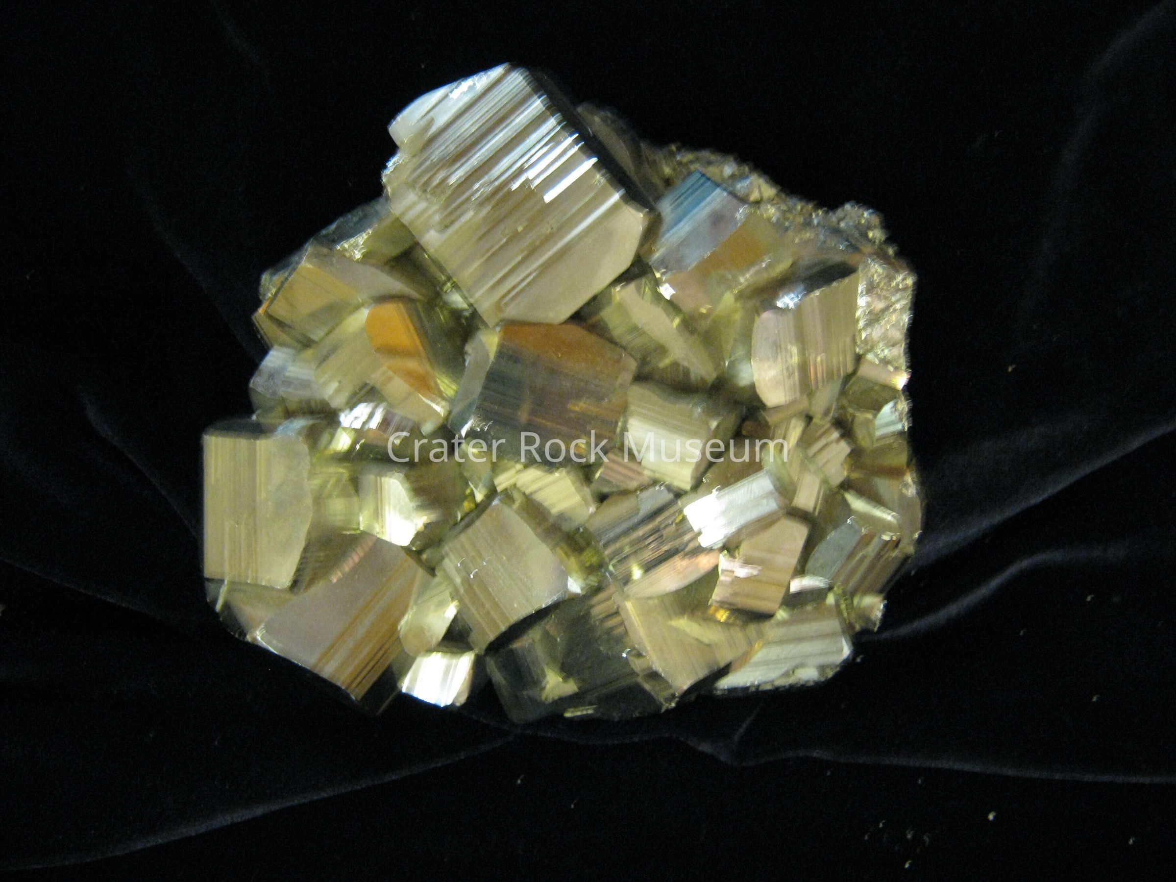 Other Characteristics: Brittle, striations on cubic faces caused by crossing of pyritohedron with cube. (note - striations on cube faces also demonstrate pyrite's lower symmetry). Pyrite (unlike gold) is not malleable.