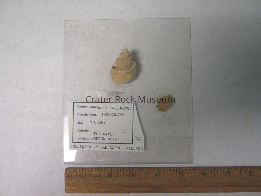 This presents issues with the given age of Miocene, since Trochonema went extinct in the Permian. Southwest Oregon has some of the oldest rocks in the state, so it is possible that the identification is correct. The given age could be wrong instead, or perhaps the fossil was weathered out, transported, and redeposited into younger sediments.