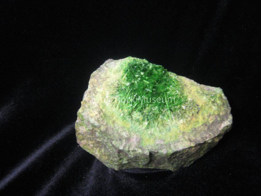 Description: Brilliant light green with small needle-like crystals in center of a outer rocky matrix. This specimen is RADIOACTIVE!