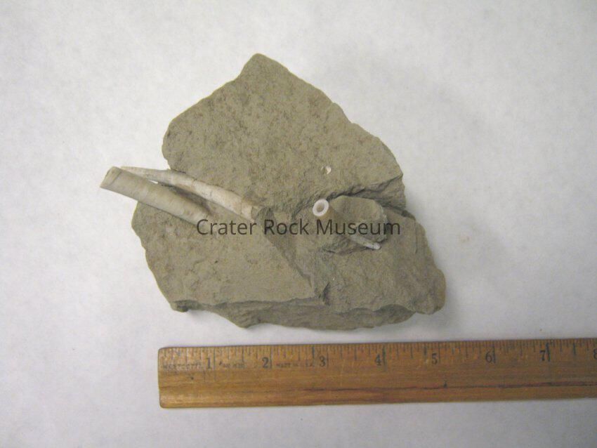 5 long x 4.75 wide x 2.75 deep. Units not given, presumed inches. Measurements seem to correspond to the overall specimen including the matrix, and not to any one of the scaphopod fossils.Location