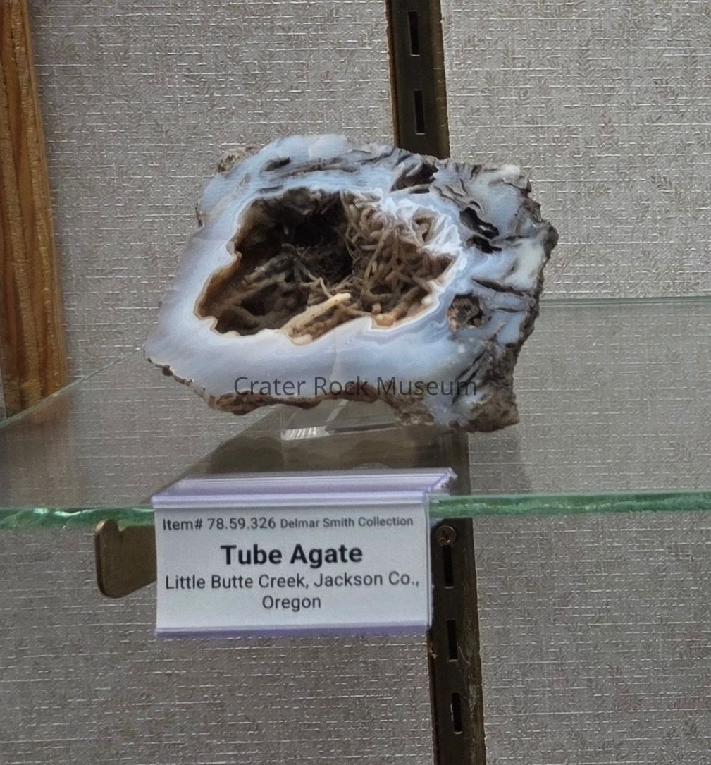 An Agate from Little Butte Creek near Lake Creek, Jackson County, OR. Cut side shows a unique and unusual mineral formation in center, resembling a Bird's Nest in Tans and Browns. Surrounding Agate is in White to Blues, some Greenish at edges. Numerous Slits are visible in fortified Agate. two surface cracks apparent.Collection