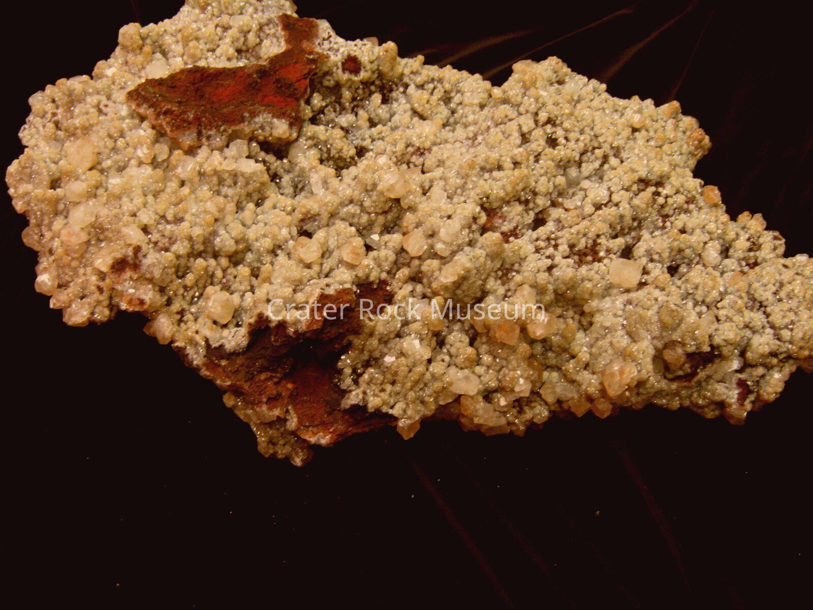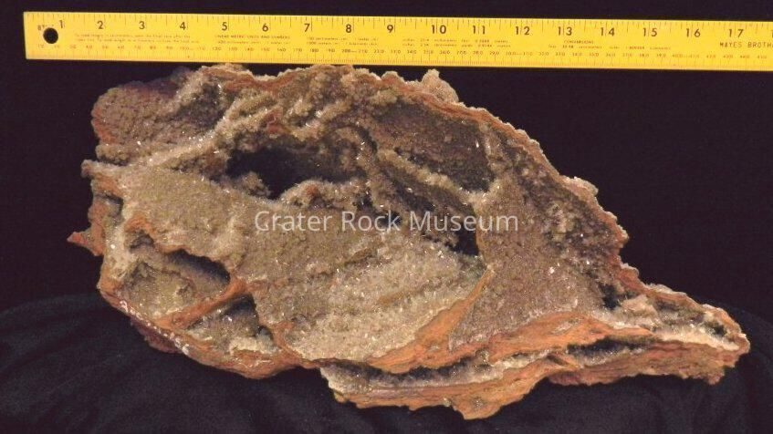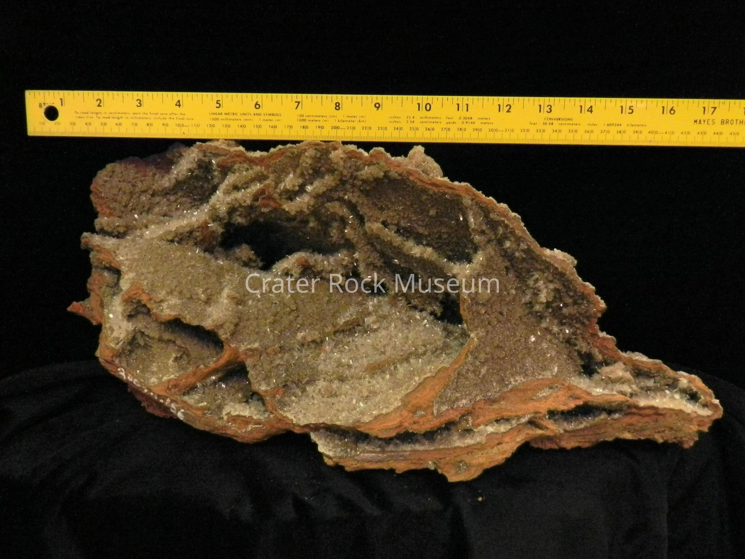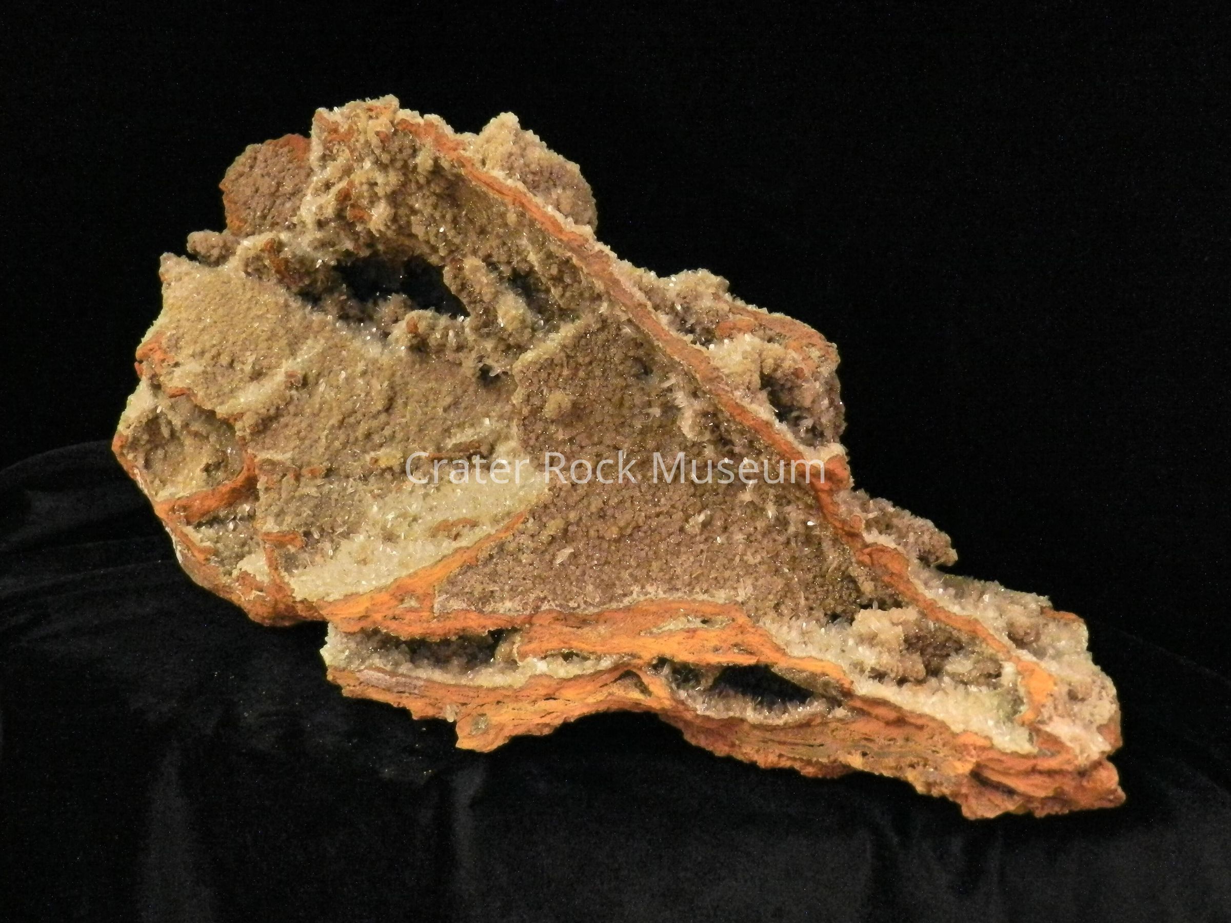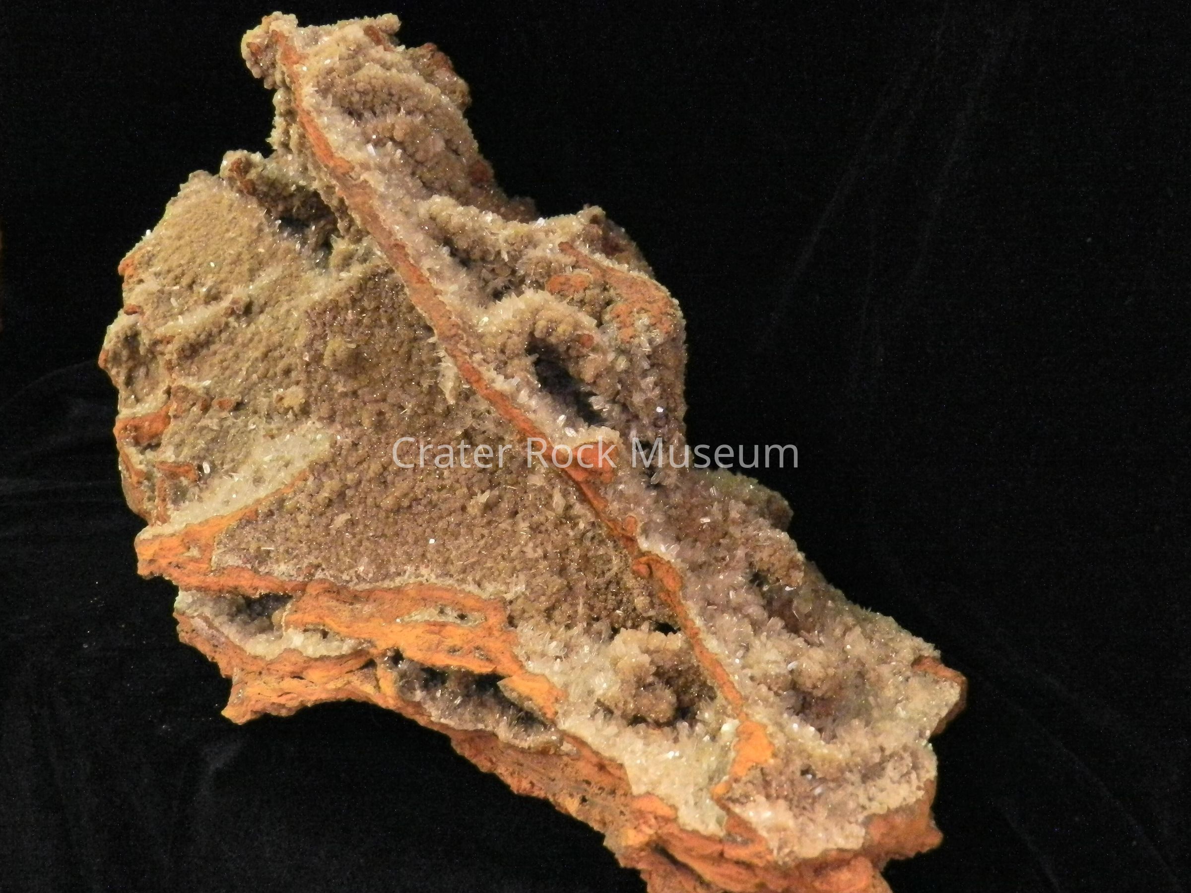 Description: Vast expanse of mini-crystals on one side; burnt-brown cavity with some crystals on opposite side.