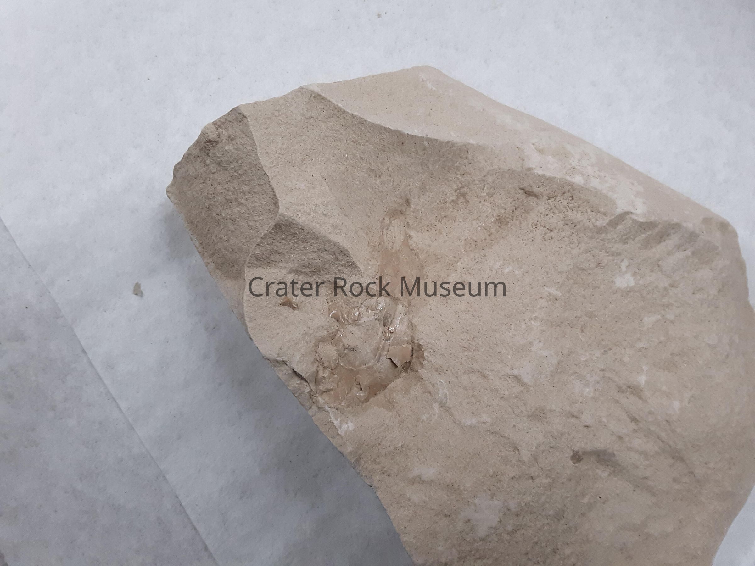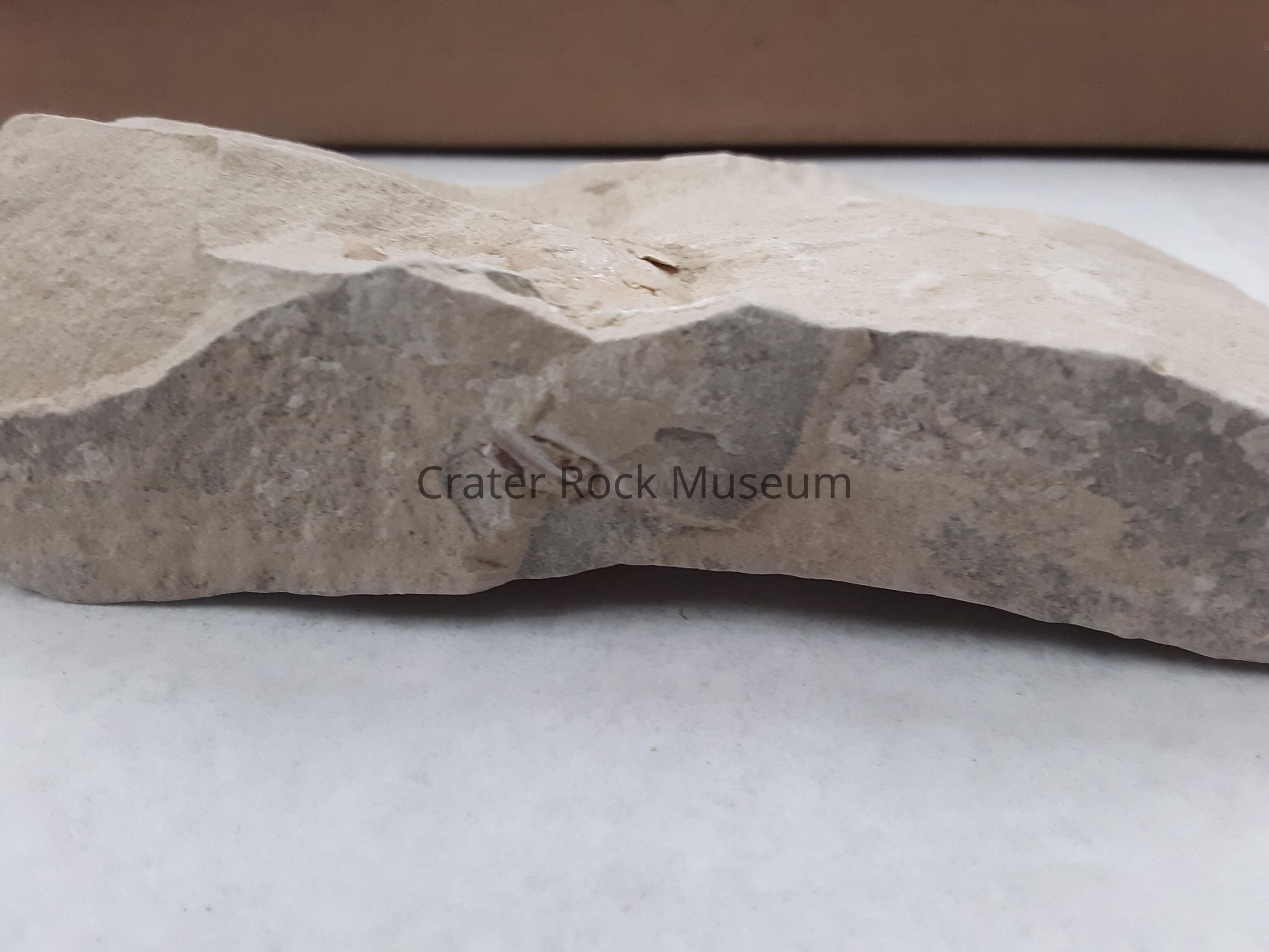 Light brown cortical bone shards on pale tan silt or claystone matrix. May be a skull? Darker brown shard in side of rock seems to be enamel (tooth?).