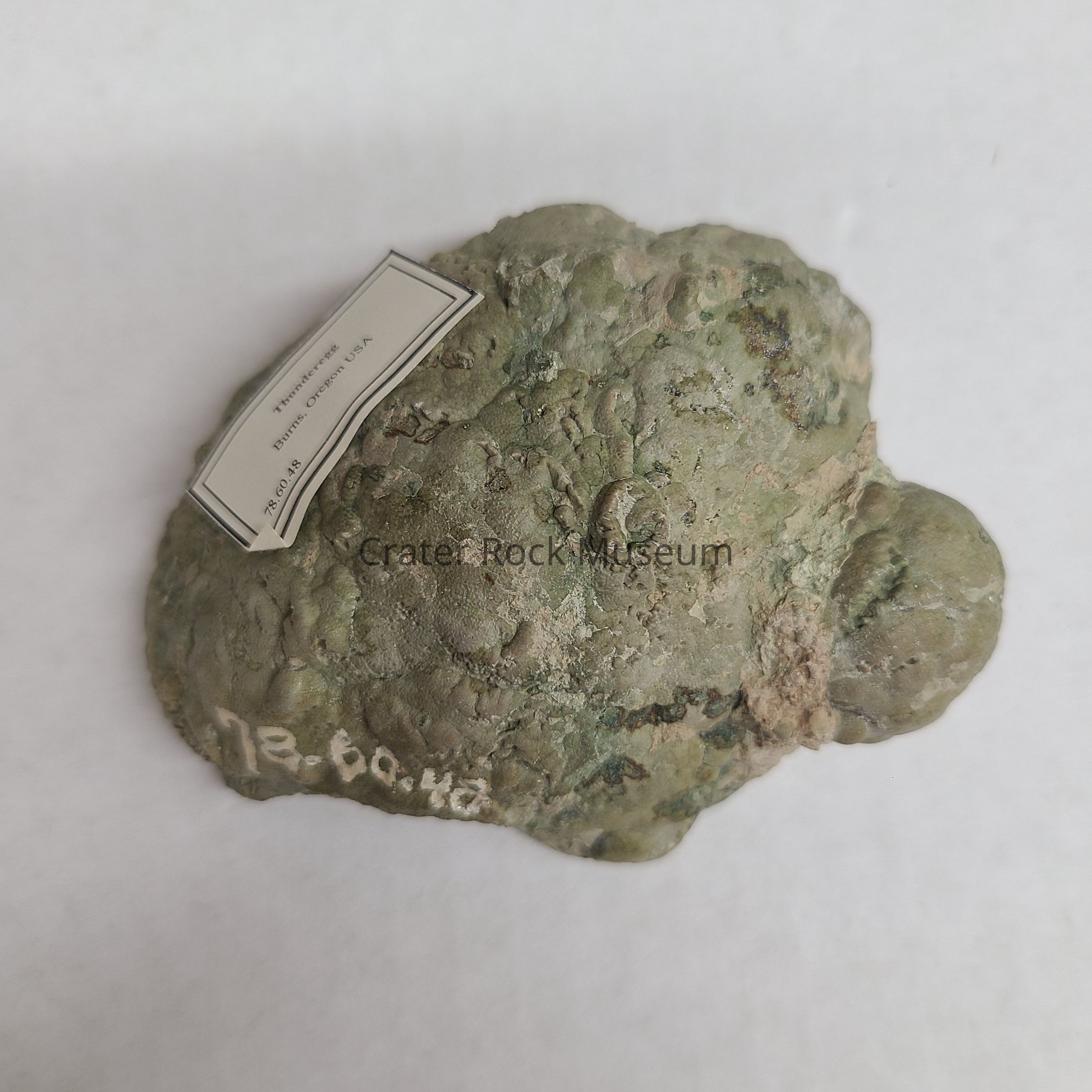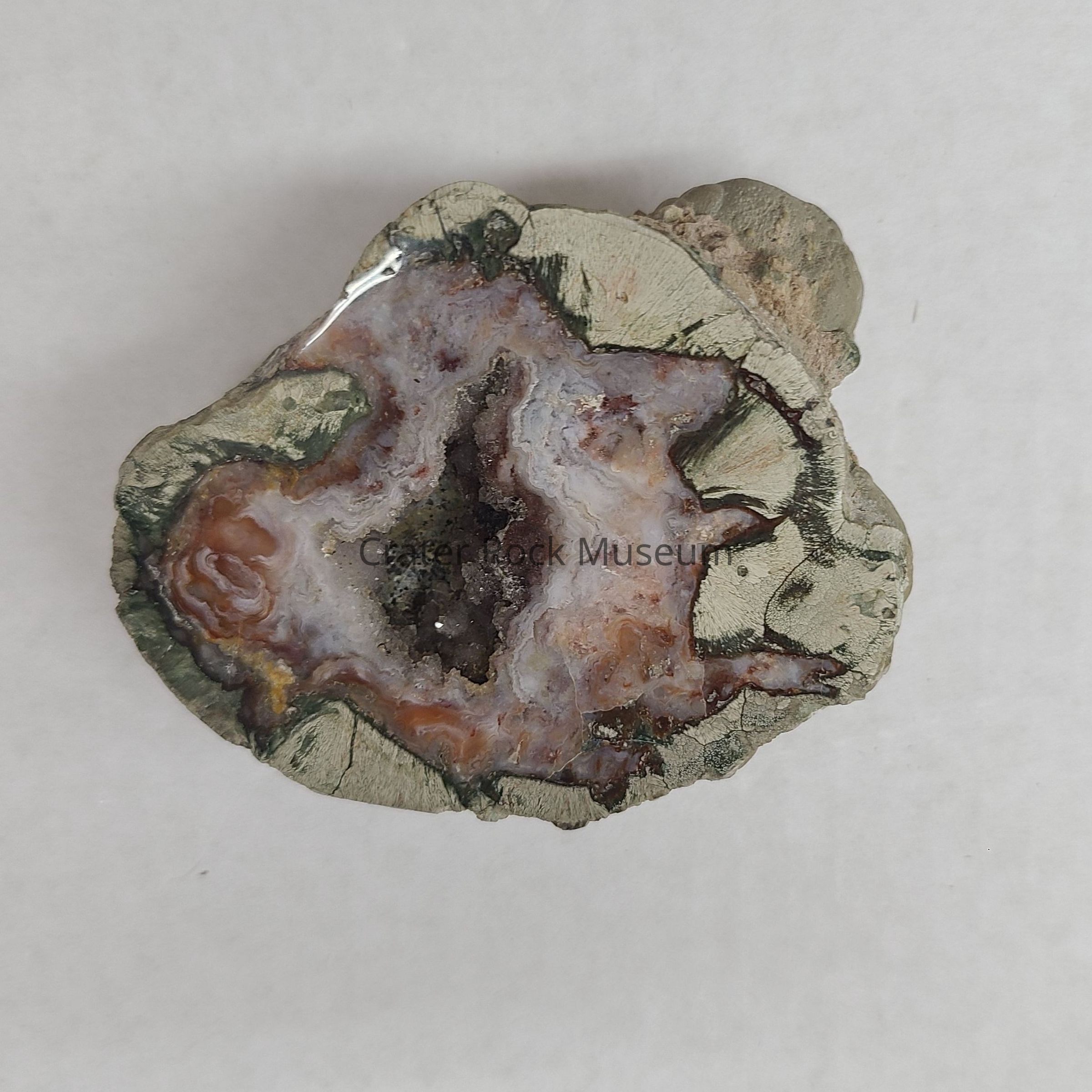 One Thunderegg cut and polished from the Buchanan Beds in Burns, Eastern OR. Grey-Green matrix with Reddish-White in interior and hollow center. Cinnabar-Mercuric Sulphide gives the Thunderegg its Reddish color.Dimensions