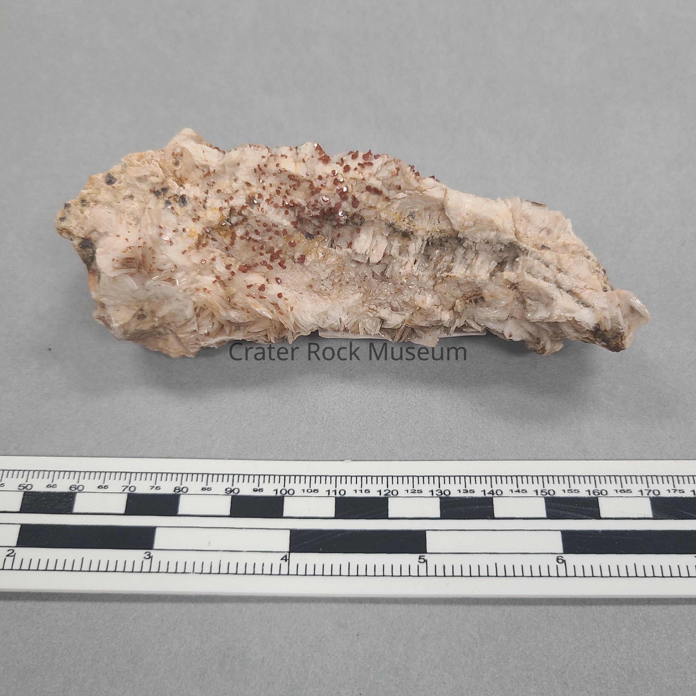 red orange (cinnamon) crystals on pinkish tan matrix, long and thin shape, slightly pointed