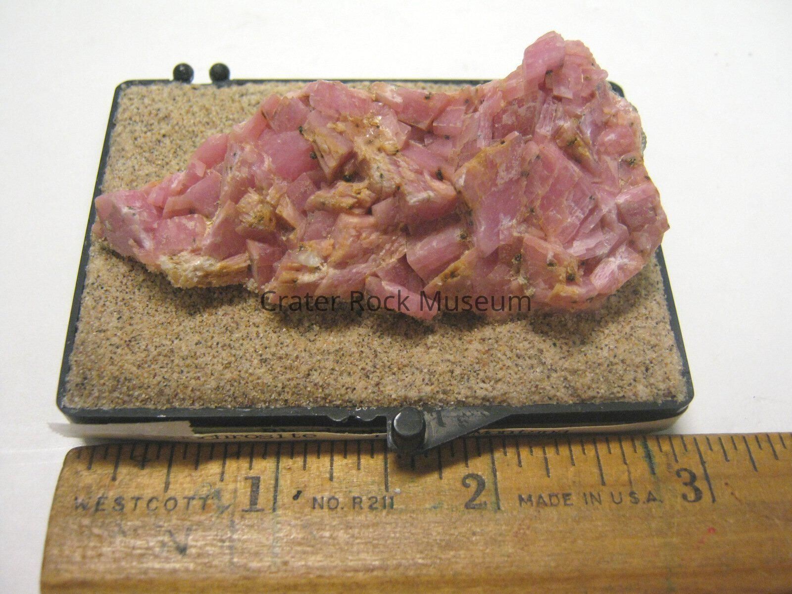 Description: Small specimen, pink in color with irregular shaped crystals.