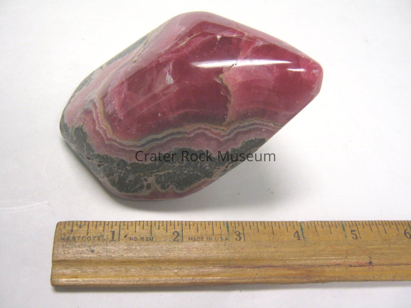 Description: Polished rounded face, banded red to pink with a black layer of matrix running through it.