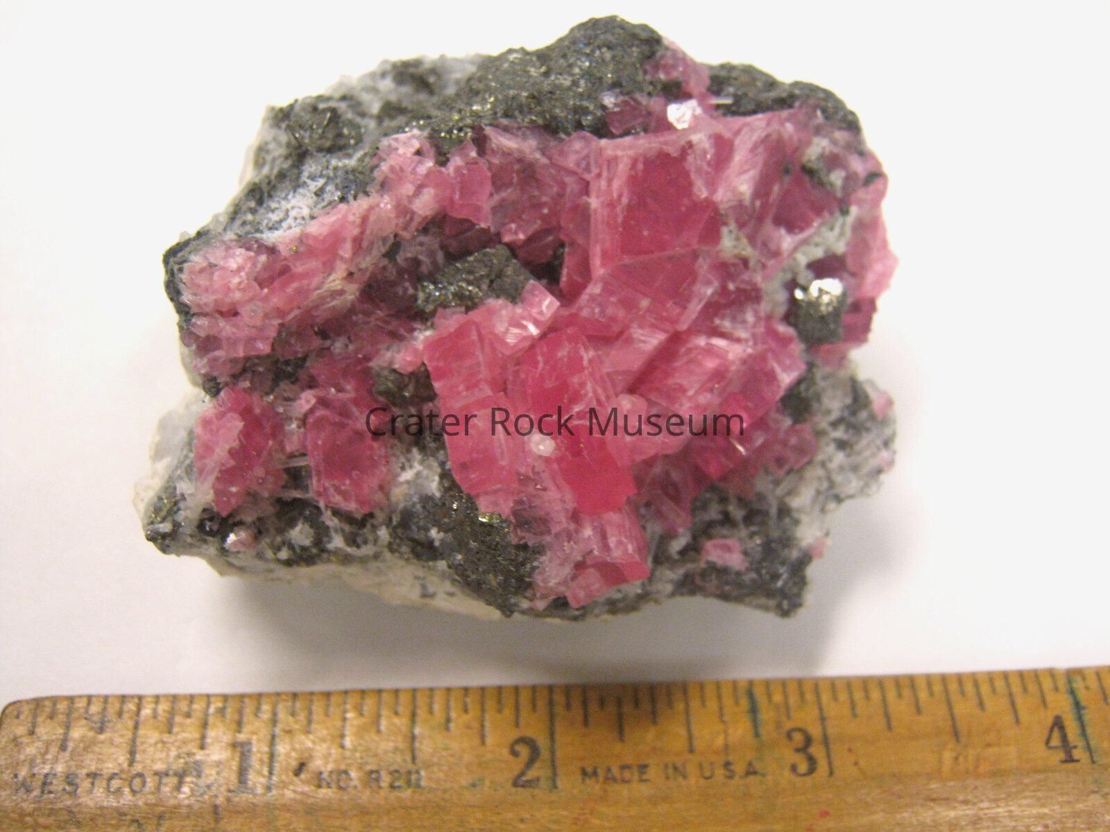 Description: Small specimen with a small grouping of light red to pink angular crystals on a dark gray and white matrix.