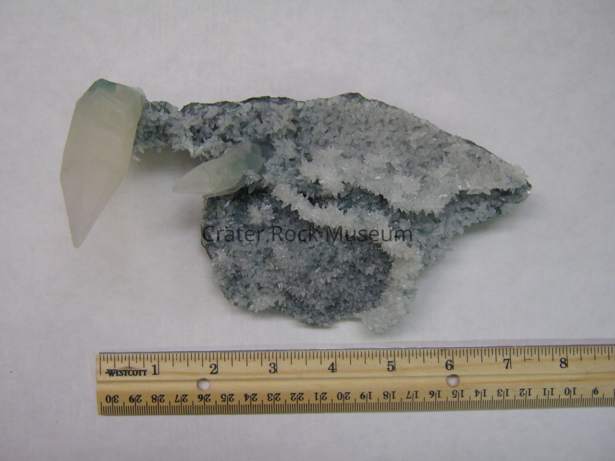 Description: Tiny white spar crystals on a light green base, some in a linear pattern, with two large white crystals protruding from the base on one side.