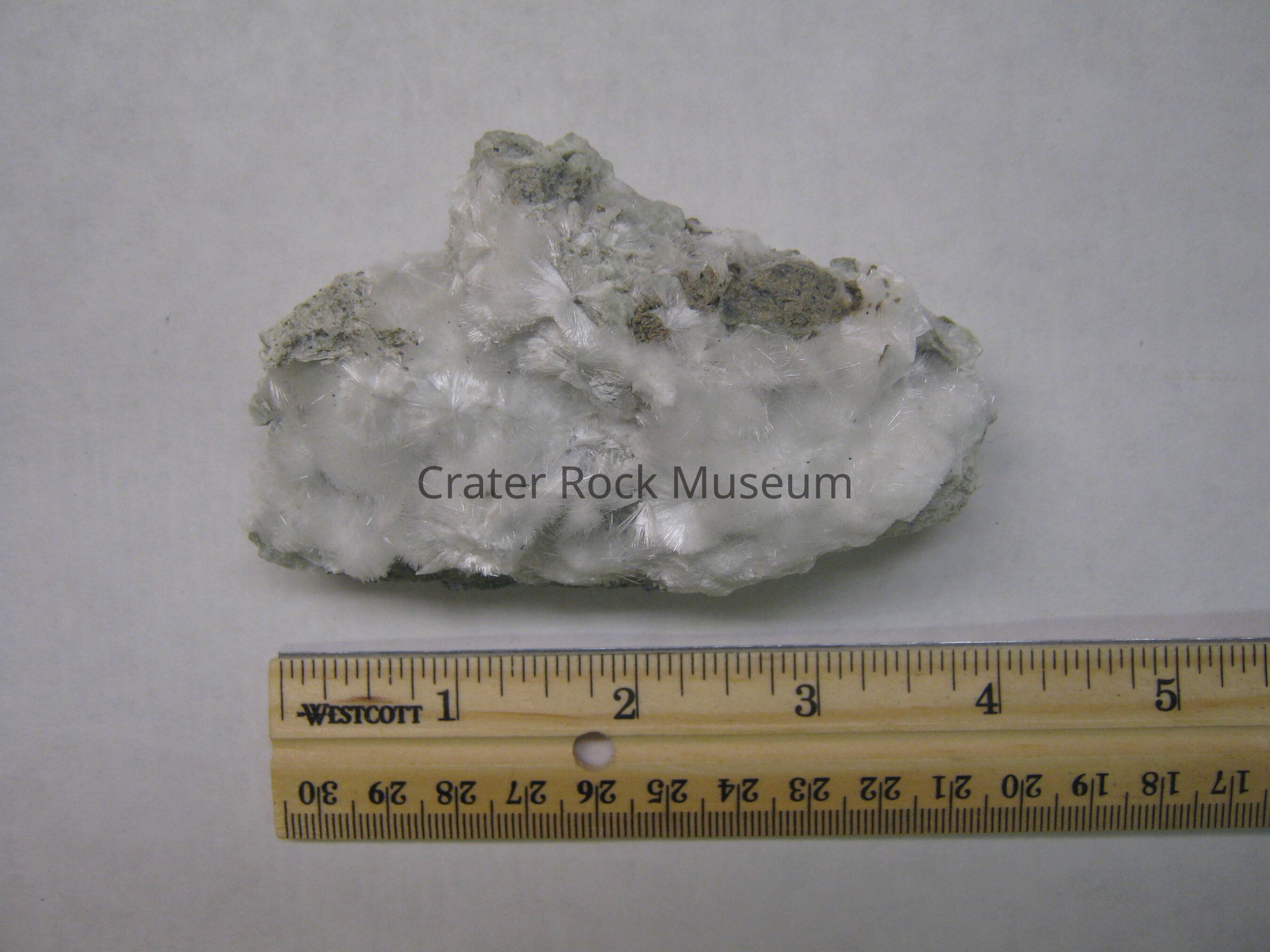 Description: White fibrous crystals (look like cotton balls) on a serpentine matrix.