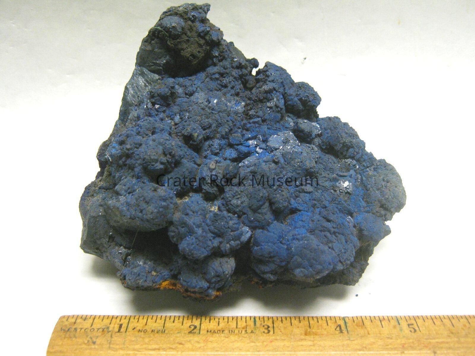 Variety: Azurite is a very popular mineral because of its unparalleled color, a deep blue called "azure", hence its name. Azure is derived from the arabic word for blue. The color is due to the presence of copper (a strong coloring agent), and the way the copper chemically combines with the carbonate groups (CO3) and hydroxyls (OH). Azurite has been used as a dye for paints and fabrics for eons. Unfortunately, at times its color is too deep and larger crystals can appear black. Small crystals and crusts show the lighter azure color well. Azurite is often associated with its colorful close cousin, malachite.Collection
