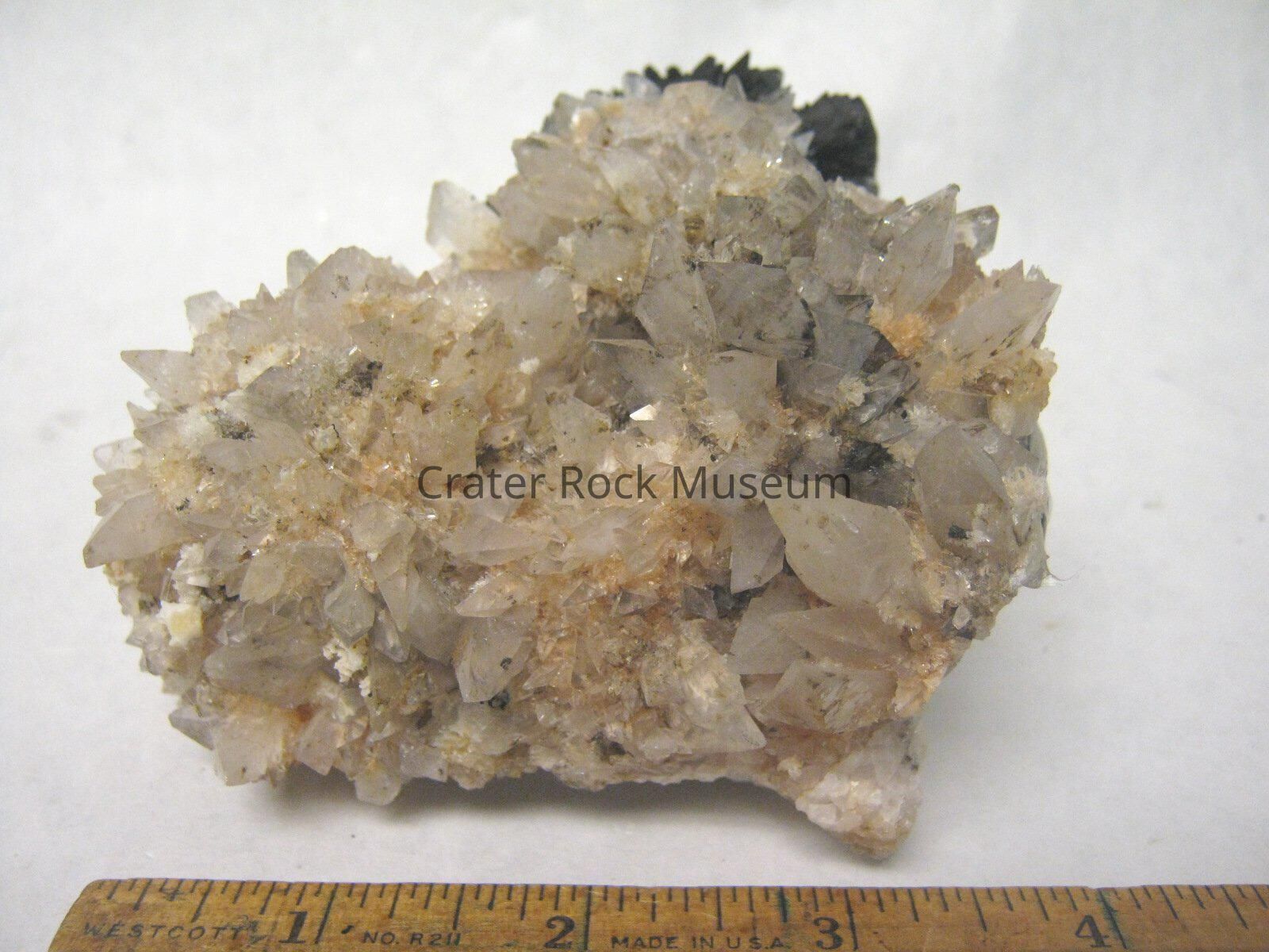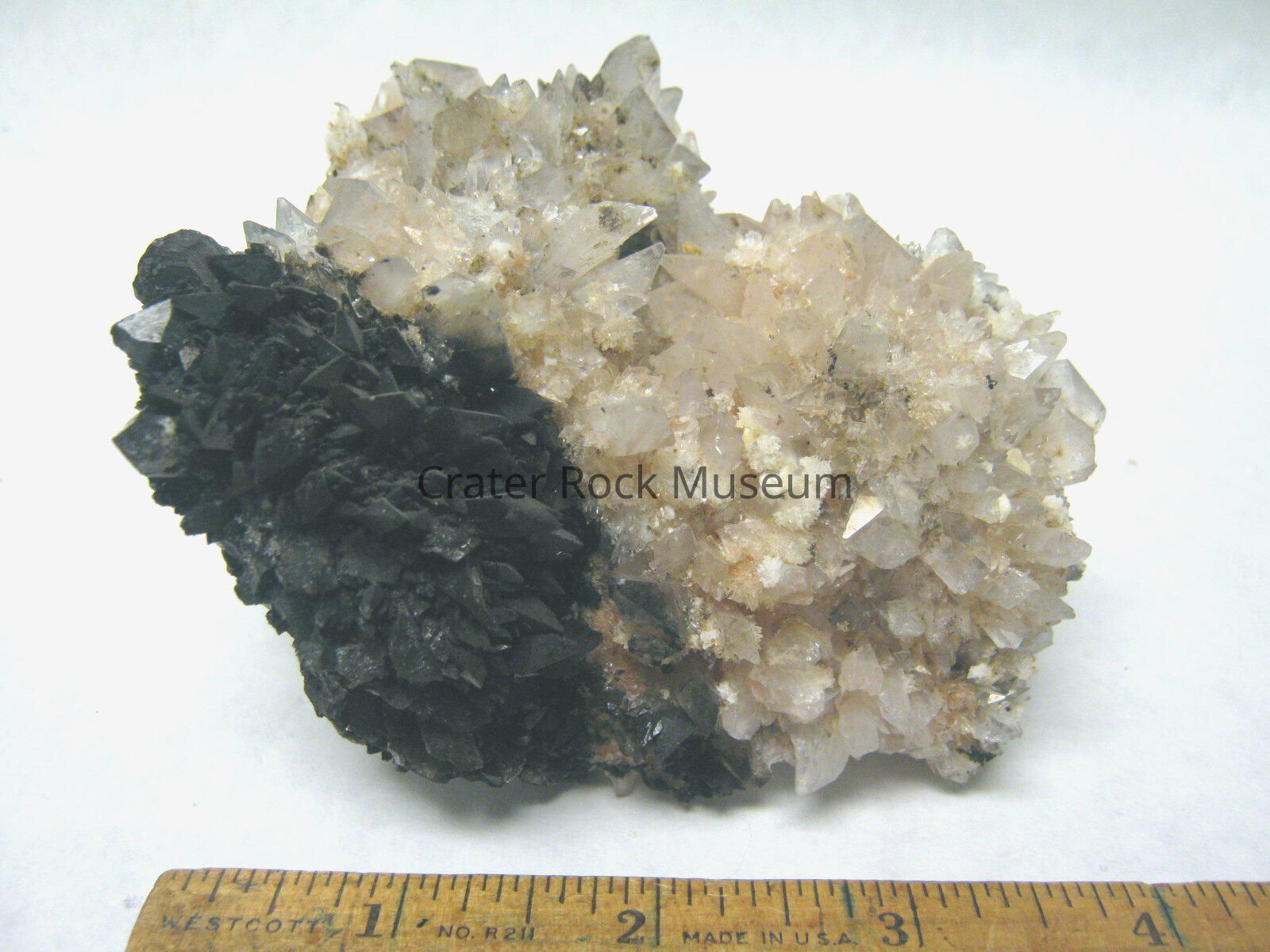 Description: About three-quarters of the specimen is a cluster of translucent to transparent prismatic crystals varying in color from dull white to gray to burnt orange. The remaining portion has a black, opaque, tightly grouped area of crystals that extend outwardly from their relative center.