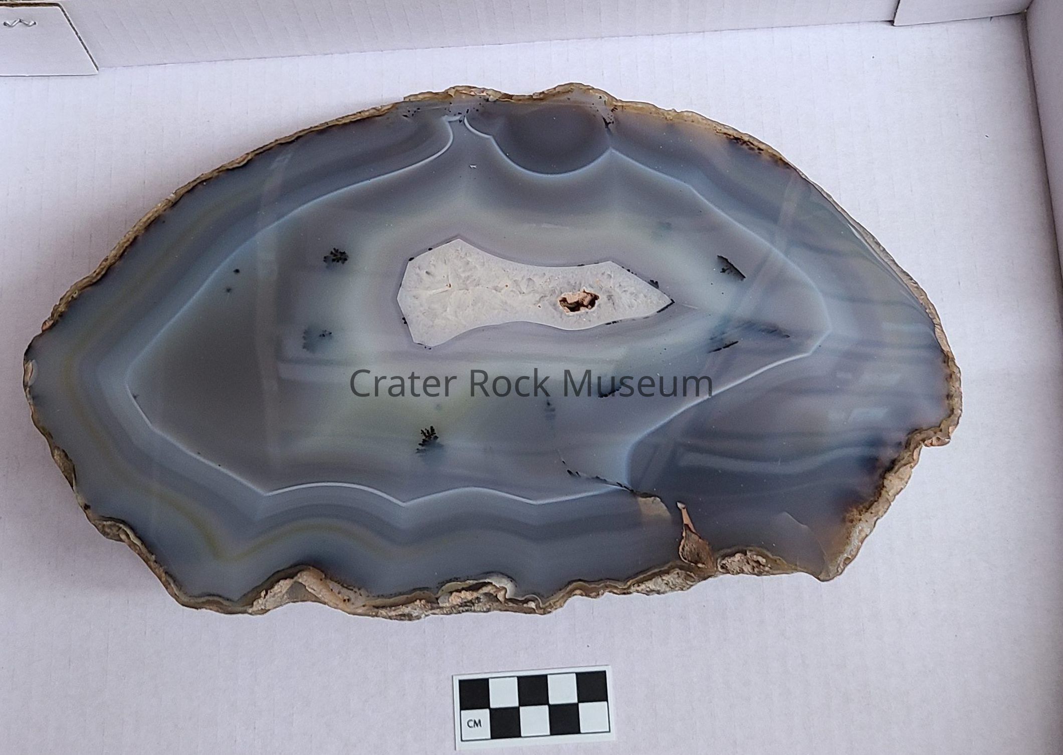 An Agate from Brazil. Polished side shows Crystalline center surrounded by fortiied Agate in Blues with Black Dendrite (Unusual), some Yellow. Surrounding Agate is Clear with Dendrite. Two open holes seen.Dimensions