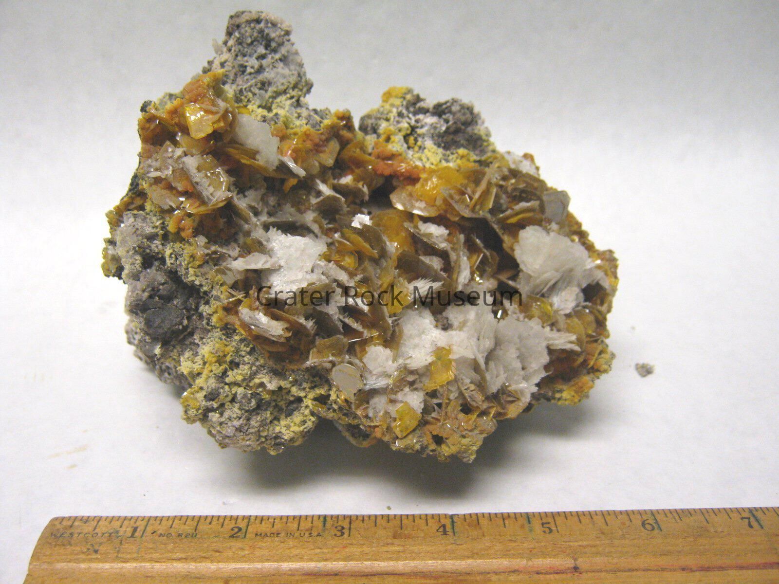 Description: A large grouping of irregular plate shaped crystals ranging in color from translucent gold to yellow with some dull white bladed Barite crystals also mixed in. The whole crystal grouping is attached to a large course grained, yellow, orange, and violet matrix.