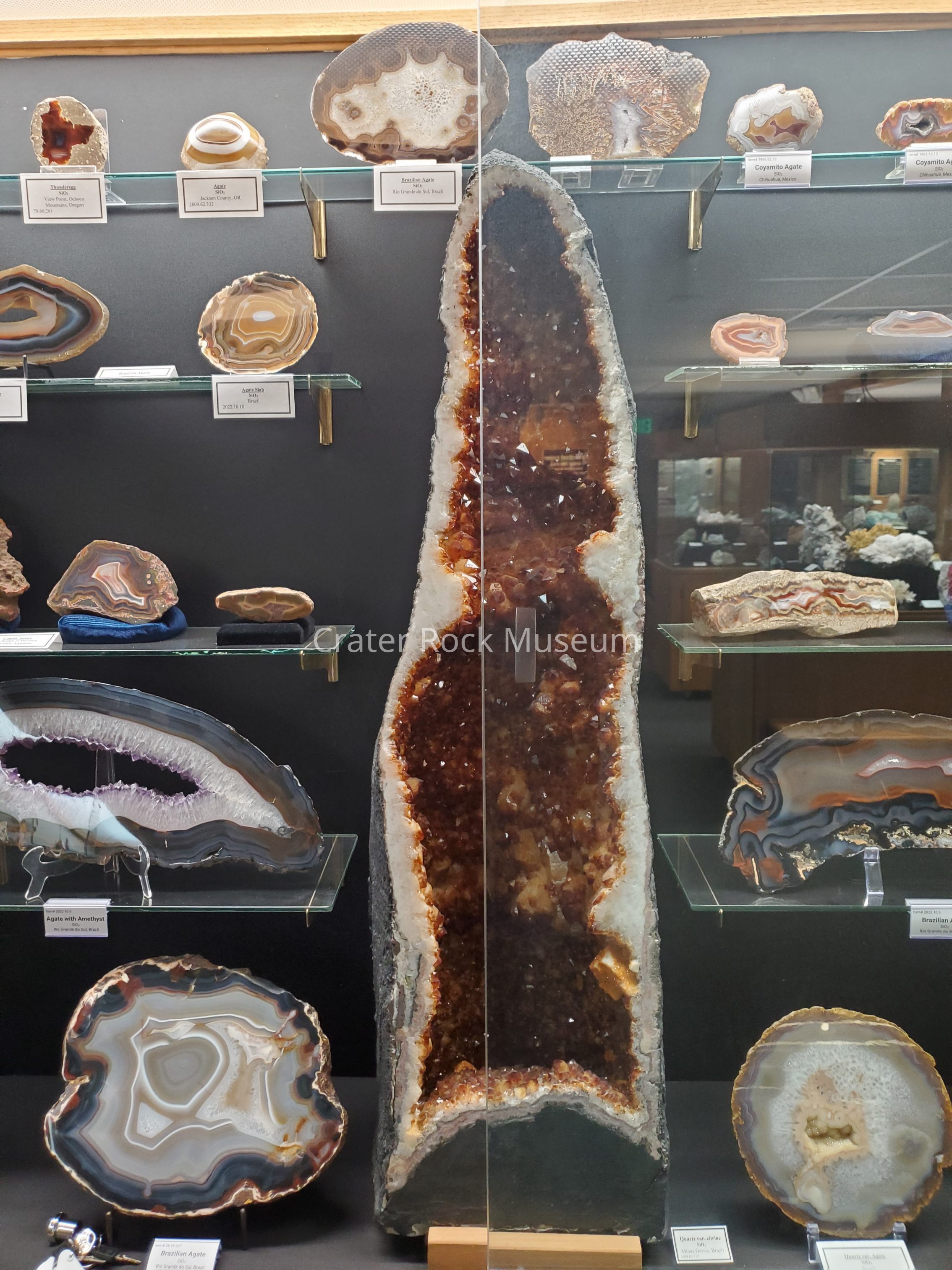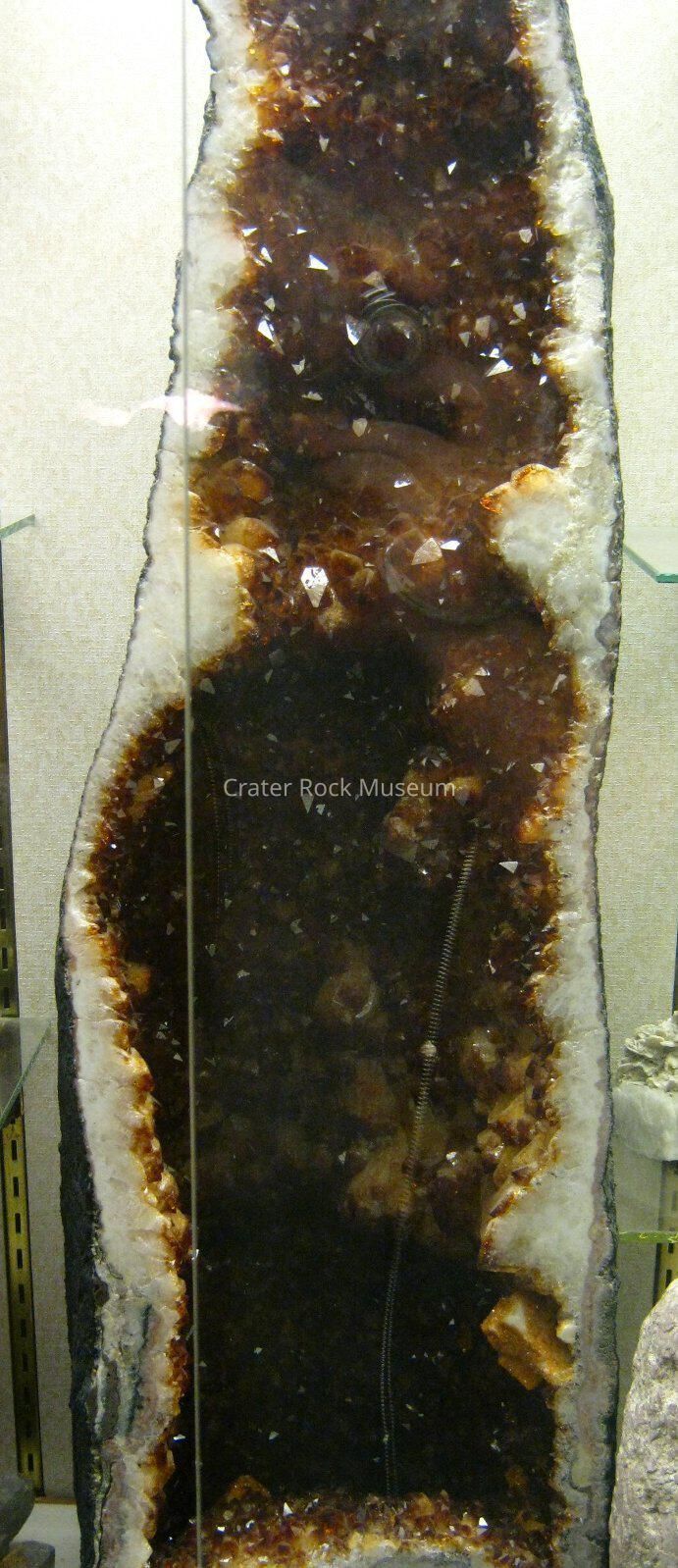 Description: Extremely large (1m), cylindrical, cavernous specimen, with a uniform yellow to brown crystalline structure throughout the inside on a white crystalline matrix.