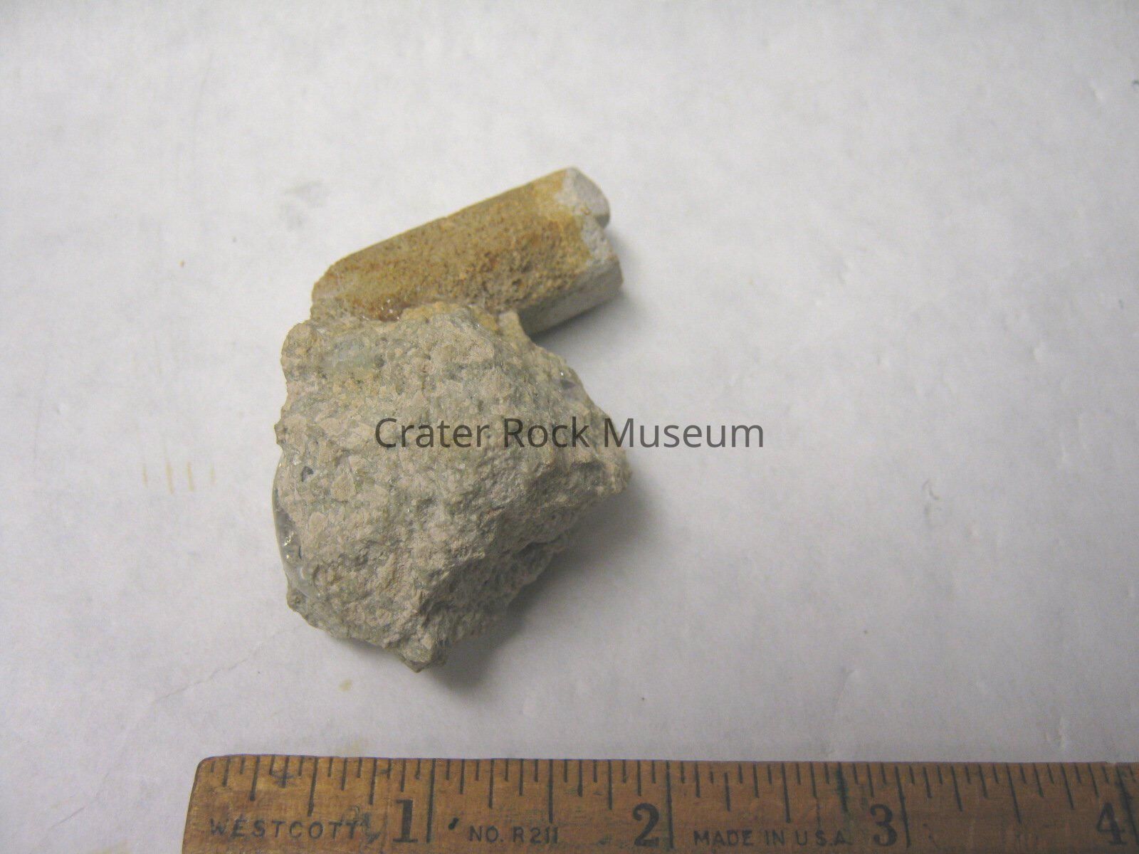 Description: Course grained, cylindrical crystal affixed to a rocky, granular matrix, both tan to light brown in color with small amounts of refractive crystals.